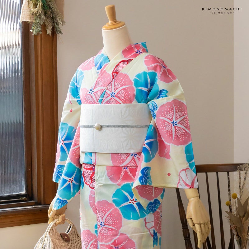 浴衣:淡いクリーム色地に、赤ピンク、ブルーなどの色使いの朝顔模様。