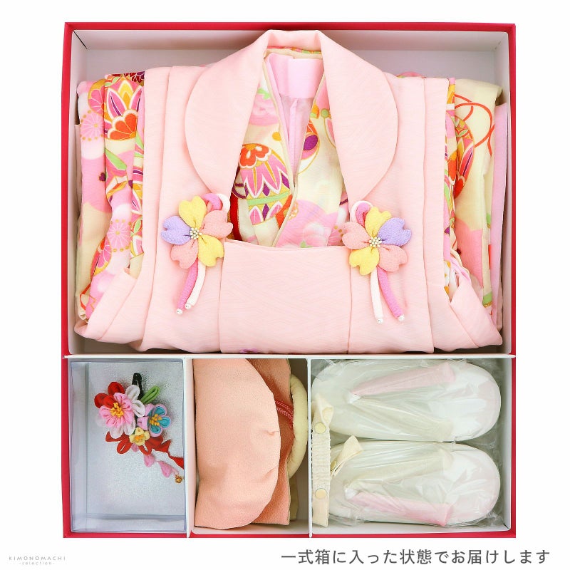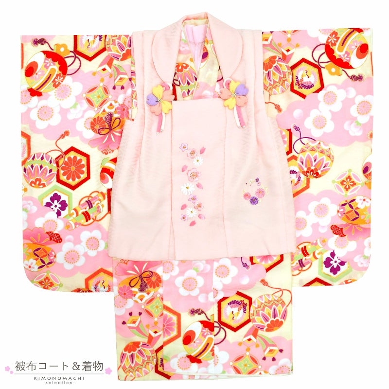 被布コートは薄ピンクの地にピンクや薄紫色の桜や花の丸の刺繍。薄ピンクや黄色のつまみの桜の被布飾り。着物は紗綾形の地模様のある淡いクリーム色の地に、薄ピンクの雲。赤、ピンク、薄緑や黄色の配色の亀甲や手毬、宝尽くし文様。ふきは淡いクリーム色。重ね衿は淡いクリーム色。薄ピンクの長襦袢。草履は白の台に淡いピンクの片ぼかしの鼻緒。オフホワイトのかかと止め。巾着は淡いネールピンク、持ち手は淡いクリーム色。紅白やピンク、水色、薄黄色などのつまみのお花の髪飾り。