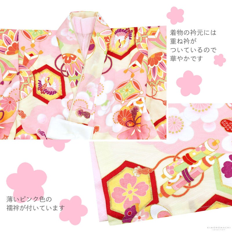 女の子の七五三に!3歳から着られる被布セットです。お着物には重ね衿が縫い付けられています。オシャレで女の子らしく華やかなデザイン。七五三だけでなく、お正月やひな祭りの節句にも。