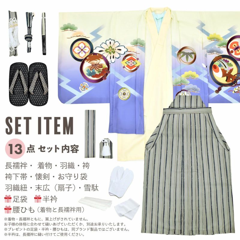 【商品内容】長襦袢・着物・羽織・袴・袴下帯・懐剣・お守り・羽織紐・末広(扇子)・雪駄・足袋(プレゼント)・半衿(プレゼント)・腰ひも2本(プレゼント)の計13点