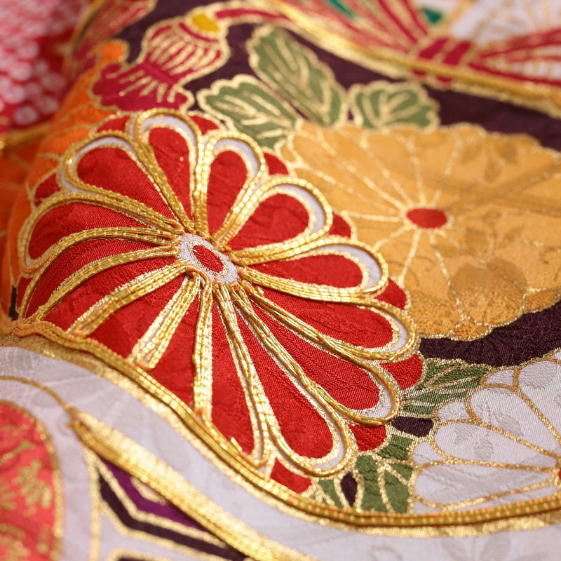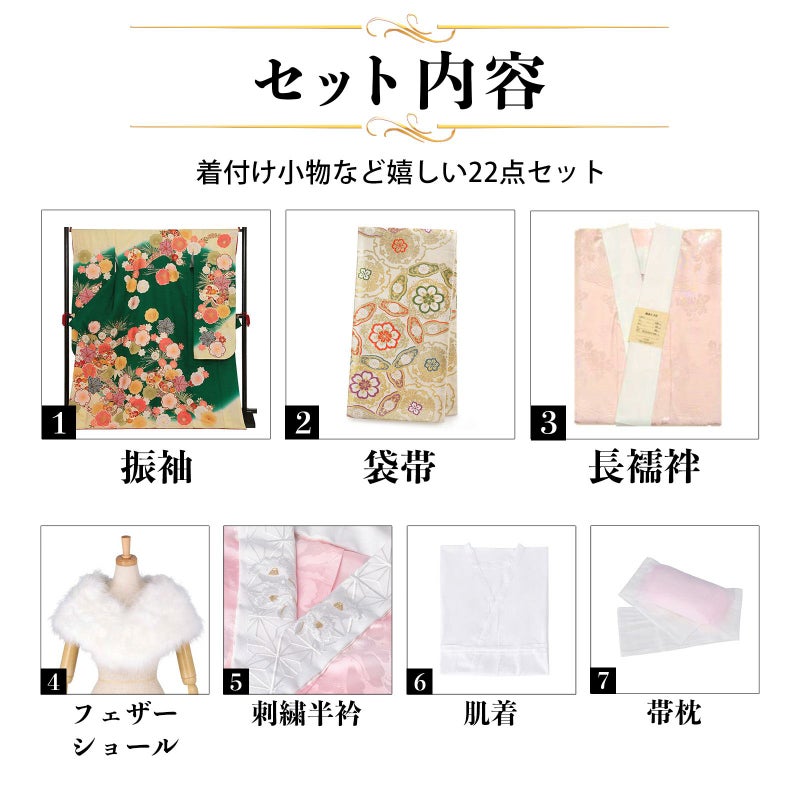 【商品内容】振袖(仮絵羽・未仕立て)、袋帯(未仕立て)、長襦袢(未仕立て)、ショール、刺繍半衿、肌着、帯枕、帯前板、帯後板、衿芯、伊達締め2本、コーリンベルト、三重仮紐、腰紐6本、足袋、着物ハンガー、振袖お仕立て、帯お仕立て、襦袢お仕立て、半衿縫い付け、胴裏正絹、長襦袢正絹の計22点セット