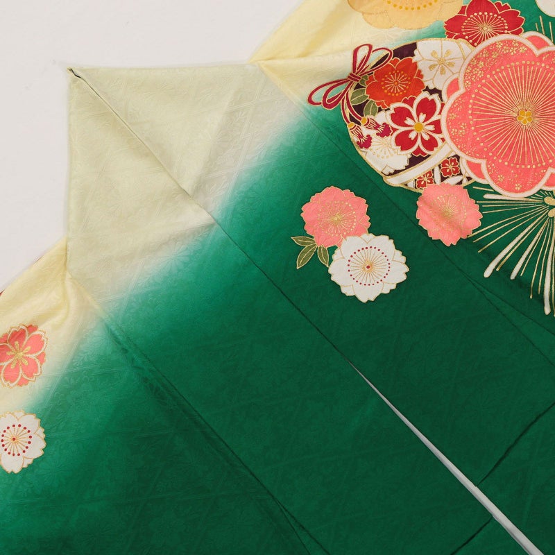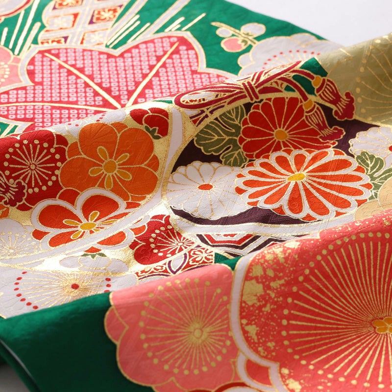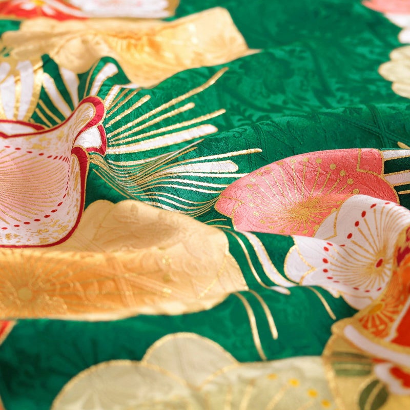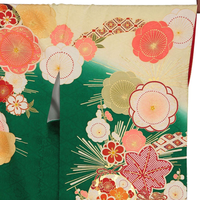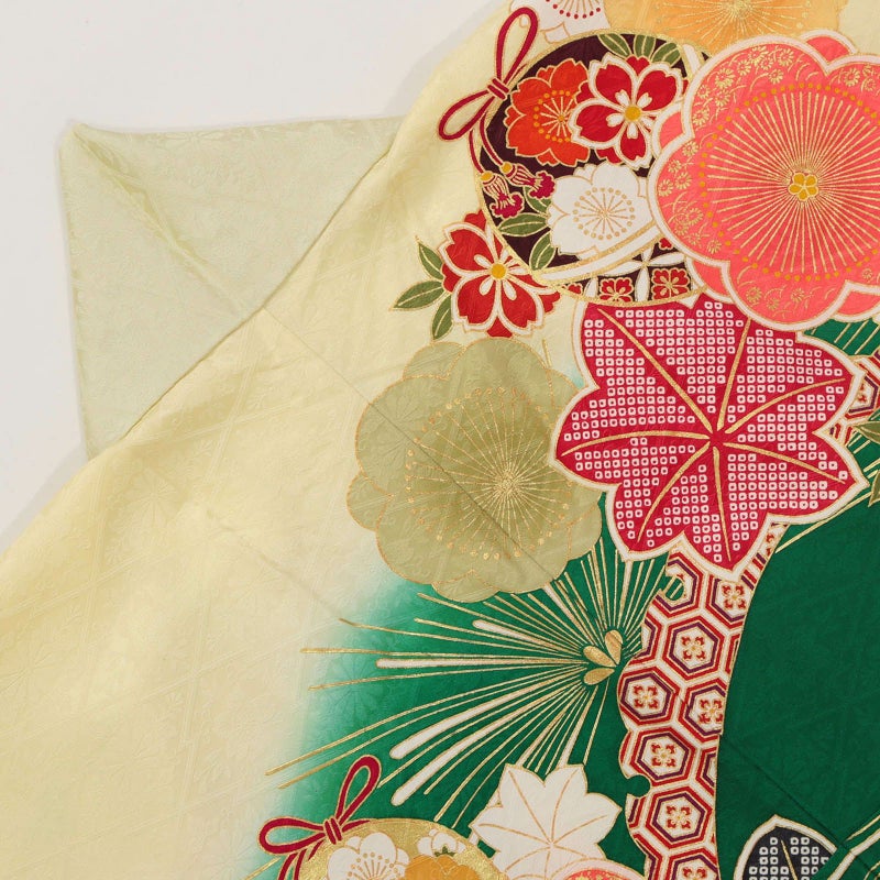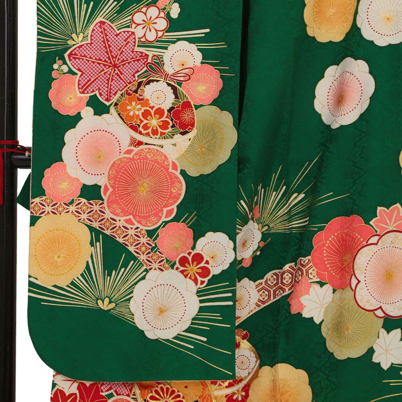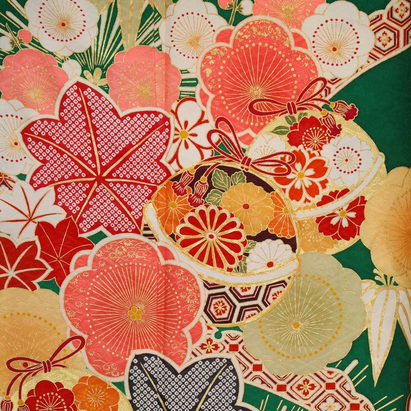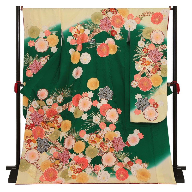 深い緑色の地色に加え肩口と袖下、裾にかけて柔らかなベージュ色の暈しを取り入れた一見シンプルに見えて、正面と後ろ姿が違った表情を見せる非常に手の込んだ京友禅のお着物です。柄には大きな毬と梅や楓に桜や松などの花々を大胆な構図で配置し華やかでいてとても品のある仕上がりを見せる人気の緑カーラーのお着物です。ぜひ着姿の楽しさに触れてみて下さいませ。