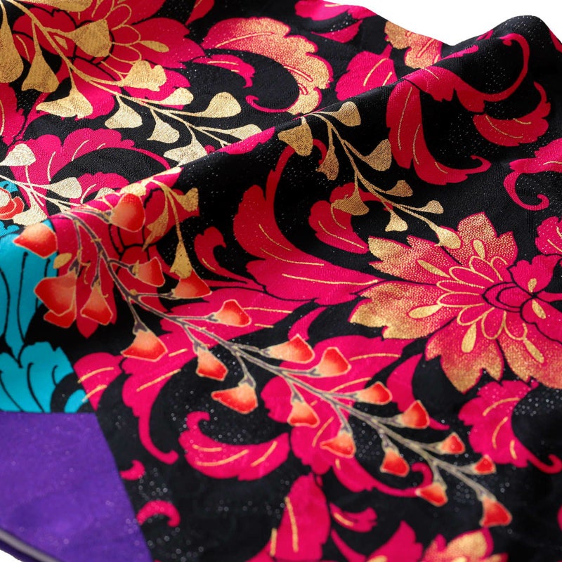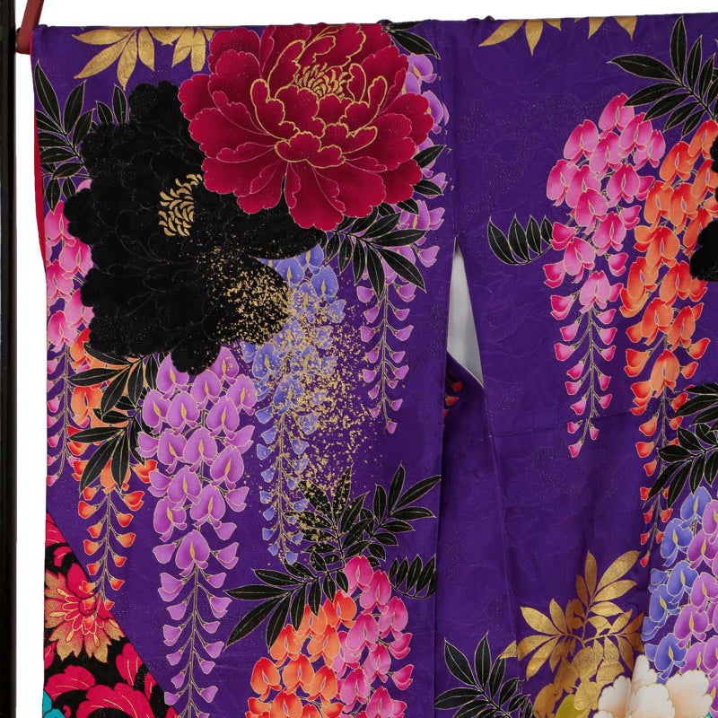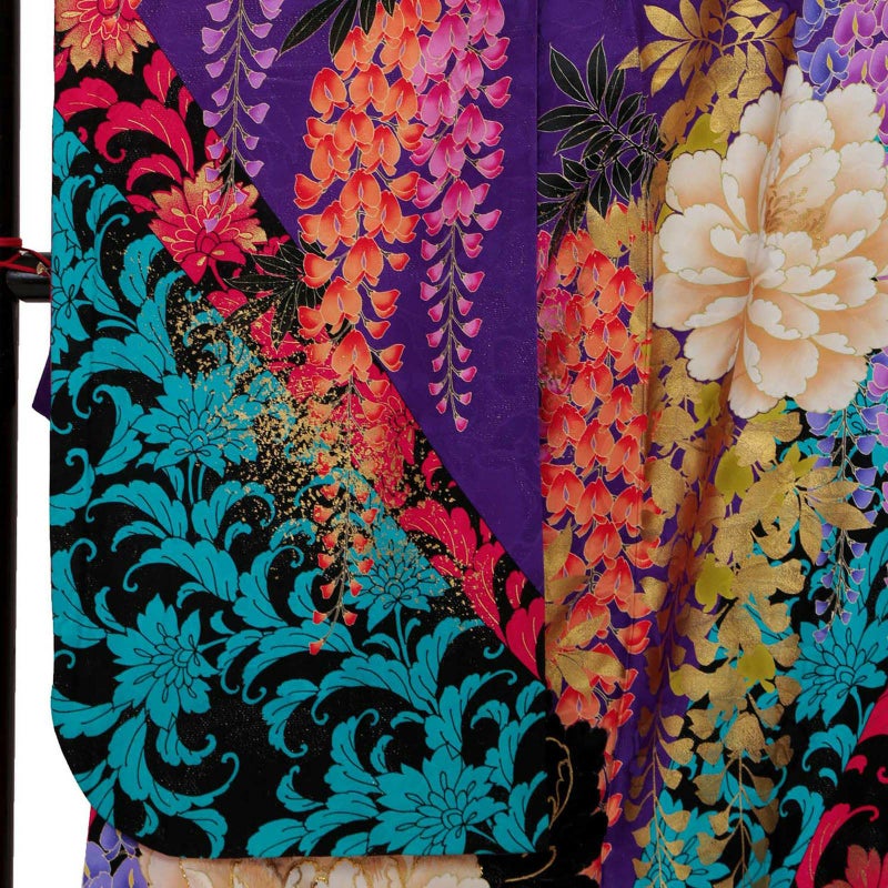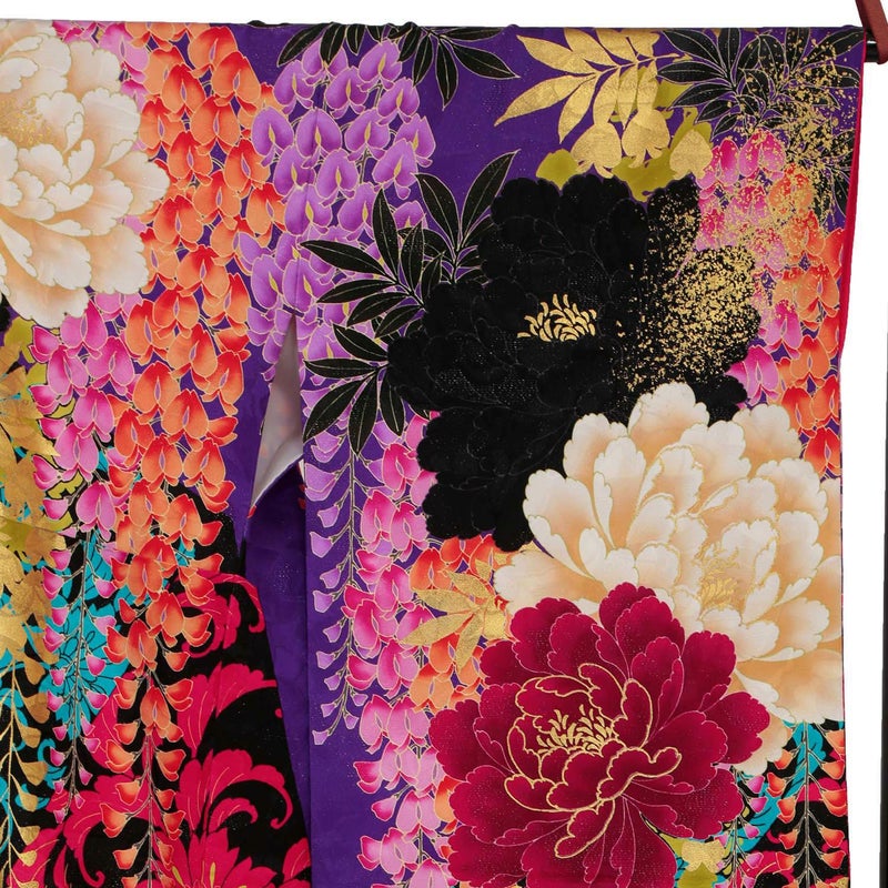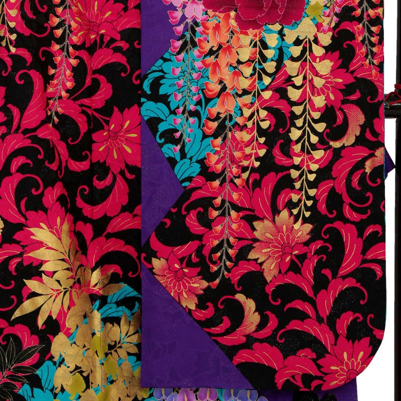 紫色に黒を配した地色、黒地部分には赤・ブルーで唐草文様を描き、白赤黒に大きな牡丹と藤の花房を描いた大変豪華かつ大胆なお振袖です。ブランド名のLako Kulaはハワイ語で宝石の意味を持ち、この振袖を着る女性すべてを宝石のように輝かせる力強い振袖に仕上げました。色・柄・構図など他に類のないお着物をぜひ。