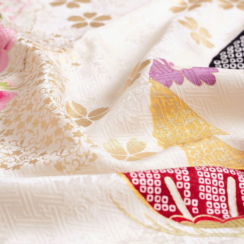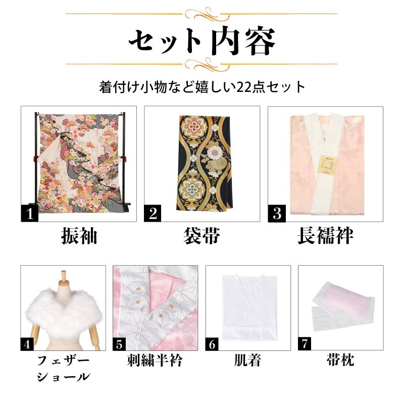【商品内容】振袖(仮絵羽・未仕立て)、袋帯(未仕立て)、長襦袢(未仕立て)、ショール、刺繍半衿、肌着、帯枕、帯前板、帯後板、衿芯、伊達締め2本、コーリンベルト、三重仮紐、腰紐6本、足袋、着物ハンガー、振袖お仕立て、帯お仕立て、襦袢お仕立て、半衿縫い付け、胴裏正絹、長襦袢正絹の計22点セット