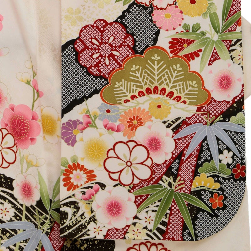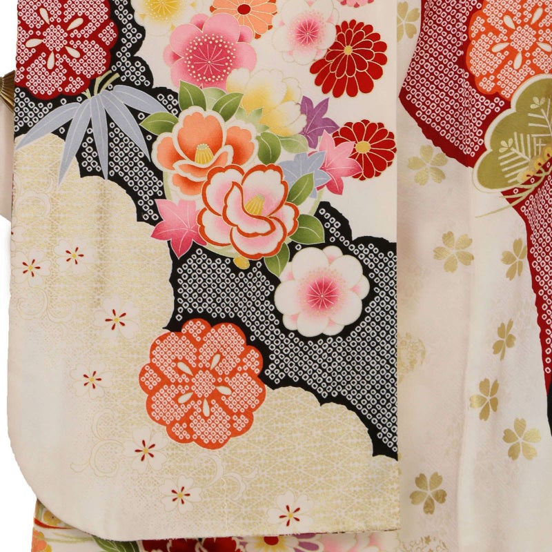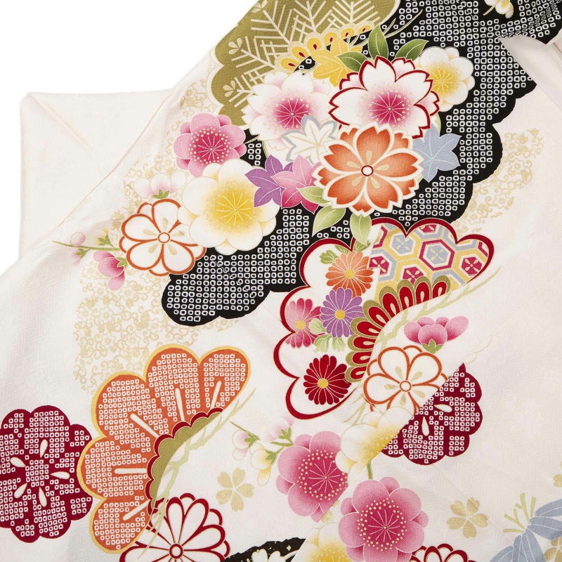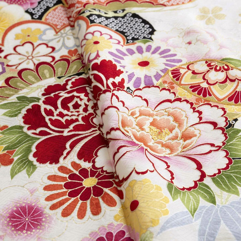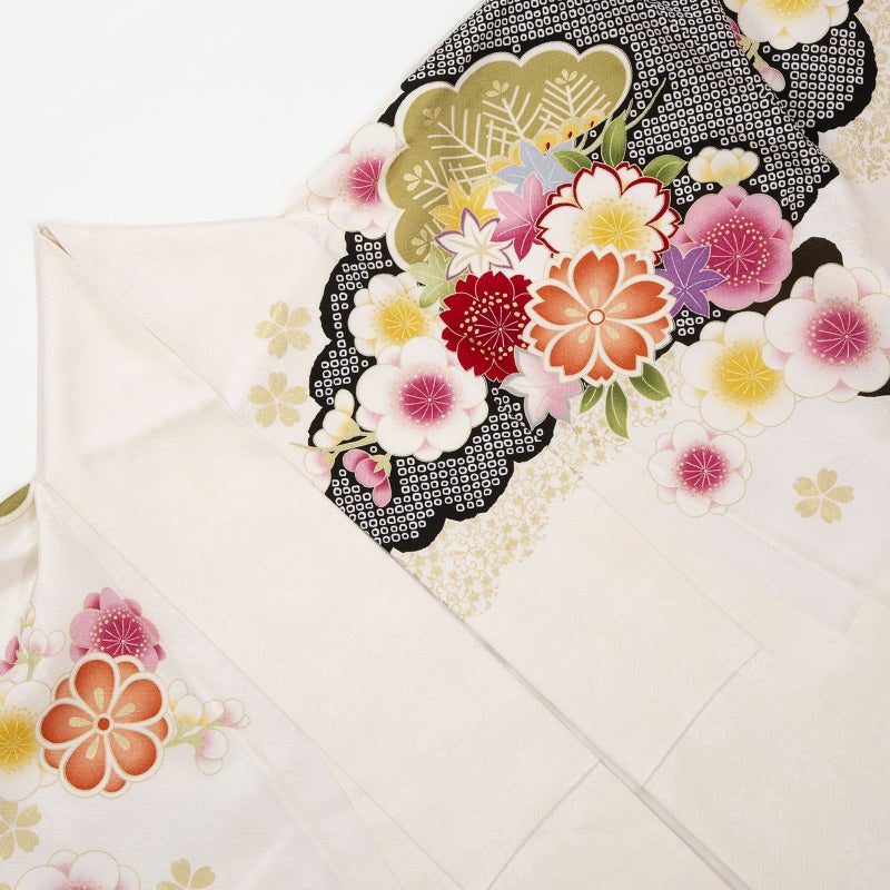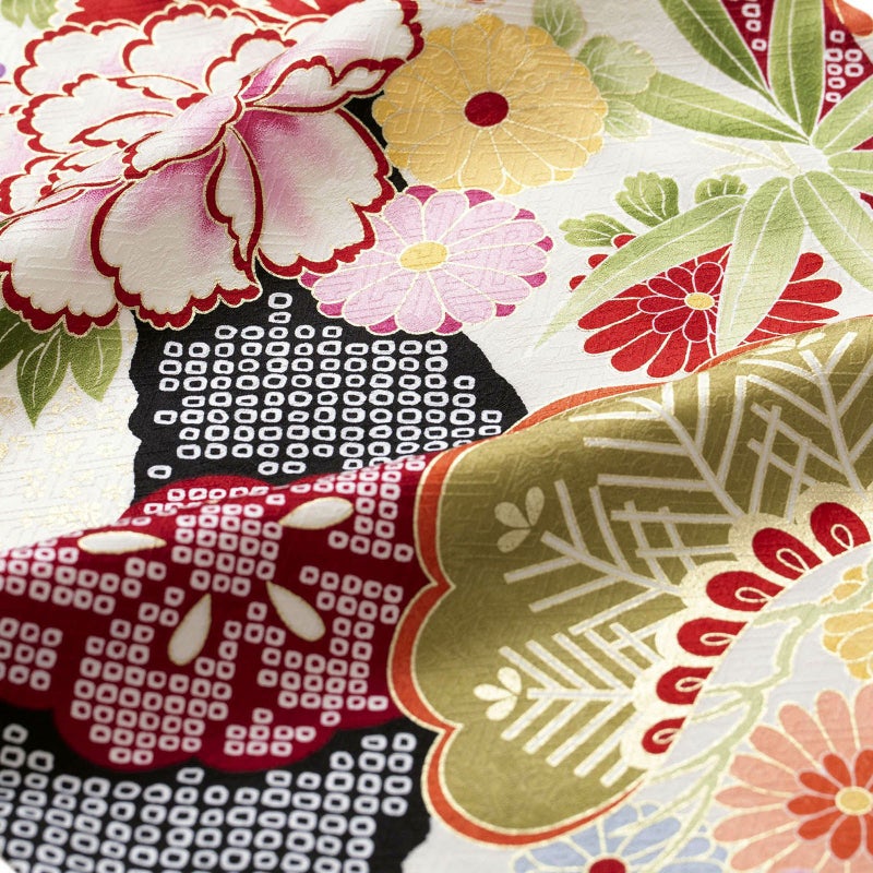 細やかなさや型の地紋生地を白地に目の引く黒と黒の疋田文様の道長取りで全体を仕上げ、松や牡丹に桜・菊などの花々を配したお色目は白ですが大変豪華なイメージも併せ持つお着物です。大変人気でどこか清楚な白地に、華やかな文様が鮮やかなお振袖、着る人をさらに引き立たせてくれるお着物です。