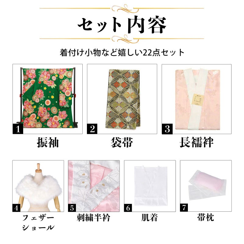 【商品内容】振袖(仮絵羽・未仕立て)、袋帯(未仕立て)、長襦袢(未仕立て)、ショール、刺繍半衿、肌着、帯枕、帯前板、帯後板、衿芯、伊達締め2本、コーリンベルト、三重仮紐、腰紐6本、足袋、着物ハンガー、振袖お仕立て、帯お仕立て、襦袢お仕立て、半衿縫い付け、胴裏正絹、長襦袢正絹の計22点セット