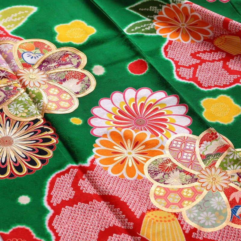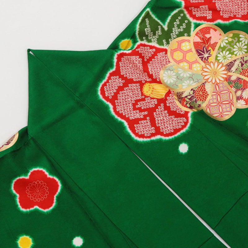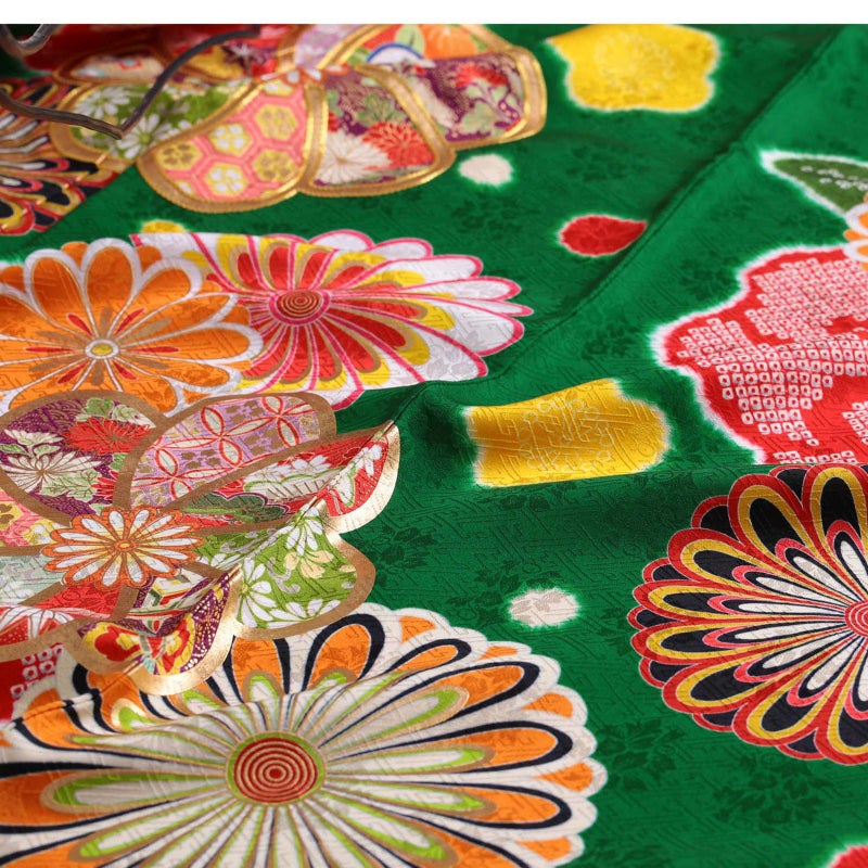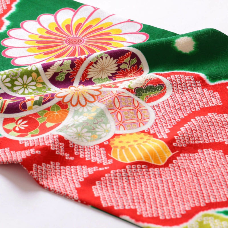 深い緑色の地色に、はっと目を引く大きな赤い椿の花を匹田柄で表現し、菊と梅の文様を散らしたお振袖です。古の小袖を思わせるアンティークでのノスタルジックな雰囲気もありながら間違いなく今を感じる鮮やかな色使いの柄取りは着る人をより華やかに彩ります。大胆な京友禅のお着物をご堪能下さい。