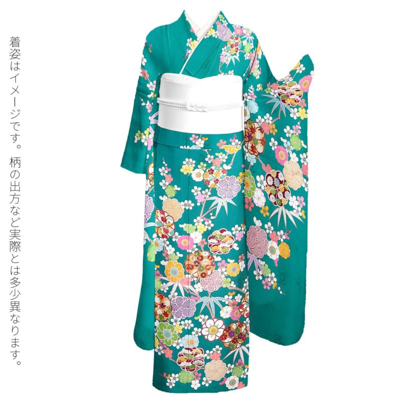 【色柄】紗綾形の地模様のある明るい青緑地。抽象的な八重梅の中に赤や赤紫の菊や橘、桜、宝尽くし紋、芥子色や紫の疋田が表現されています。白、ピンク、薄黄色や緑色の枝梅に、水色の竹。ポイントの金彩や金駒刺?が豪華さを添えます。八掛は紗綾形の地模様の青緑地に梅紋。