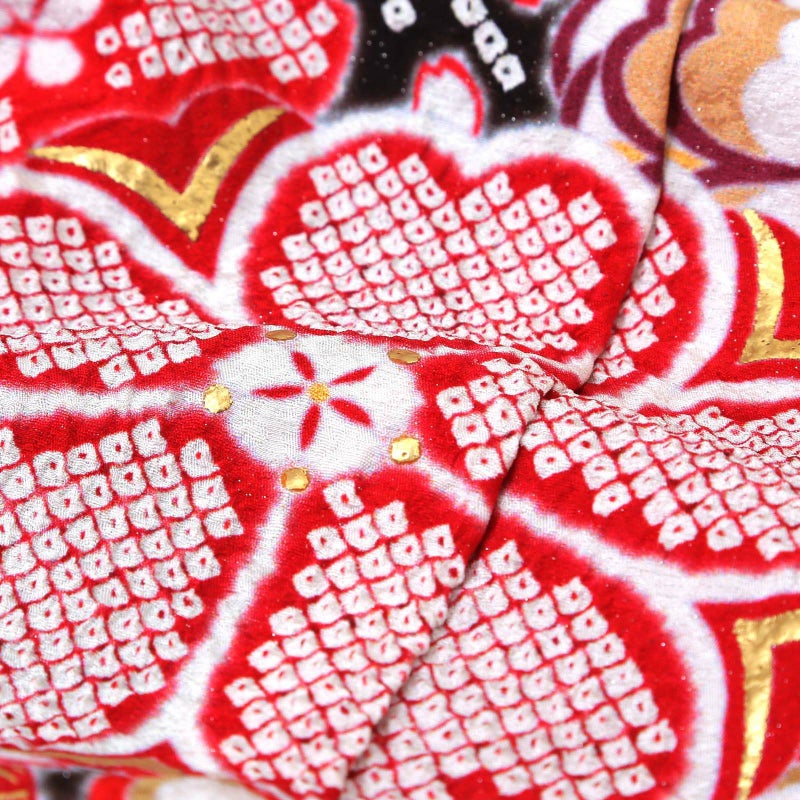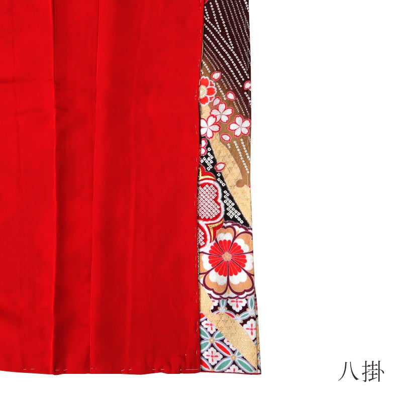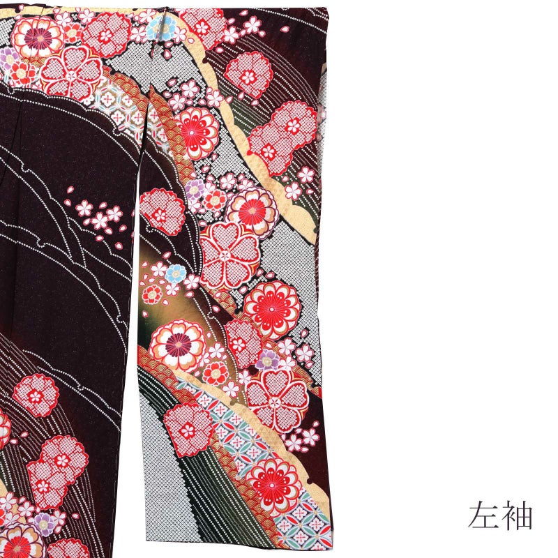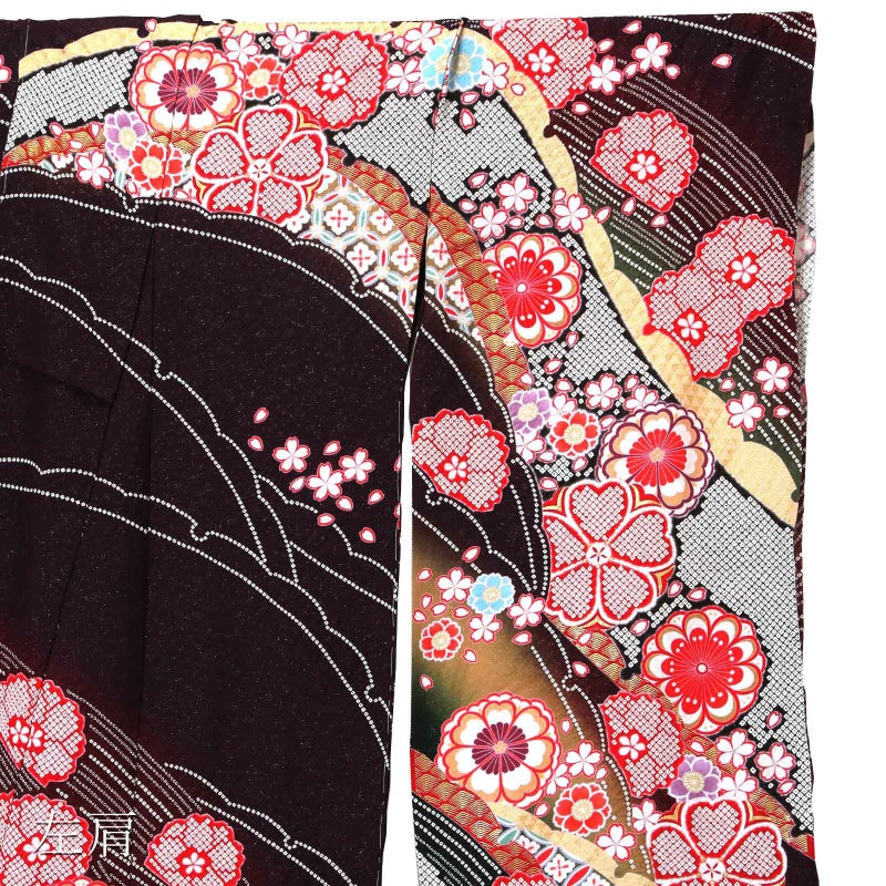 【色柄】金通しに細かな地模様のある黒みの赤紫地。斜めに流れるように配した雪芝取りの中に、赤や青磁色、深緑色などの花七宝、赤やベージュに金彩の吉祥文様が表現されています。赤や黒の疋田の花紋や薄紅、水色の桜の花々が華麗さを添えています。八掛は赤。