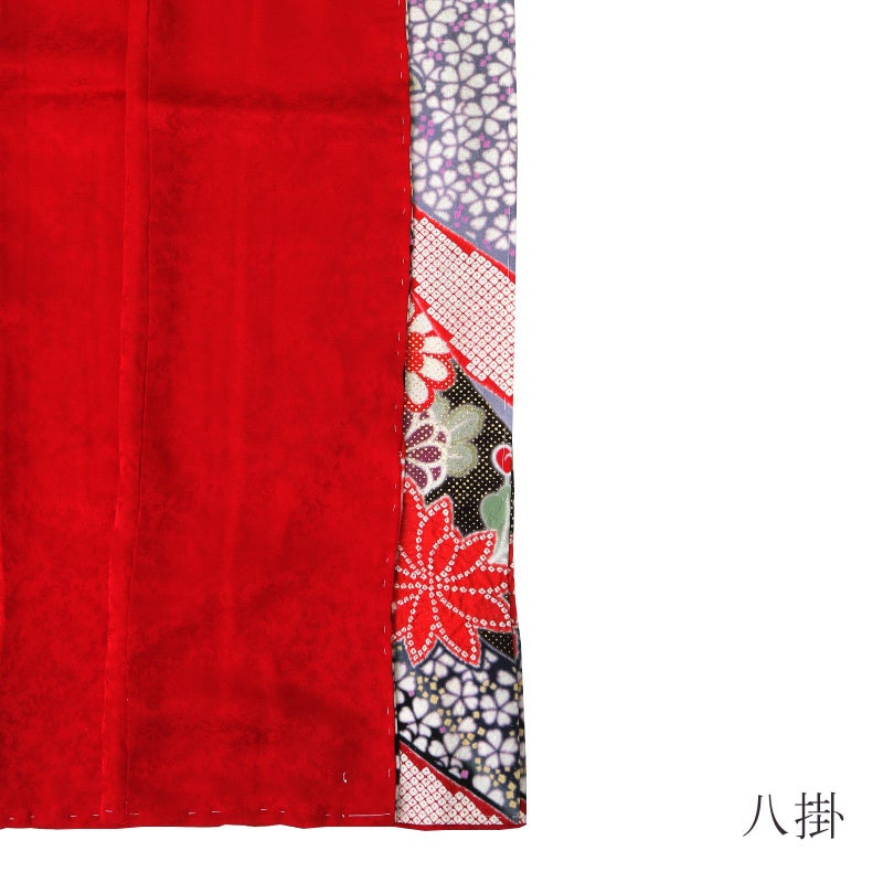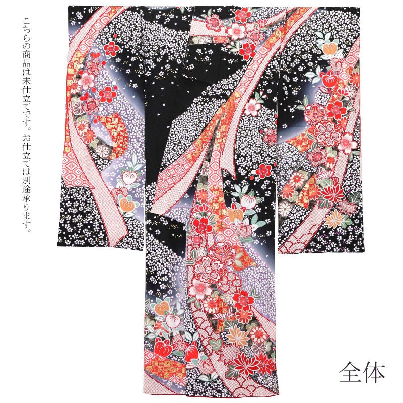 【色柄】金通しに細かな地模様のある黒地。淡い藤鼠色のぼかし。白く染め抜かれた小桜に淡いピンクの挿し色、ピンクに淡い黄色の砂子。赤や朱、薄紅に疋田や金彩で吉祥文様を描いた蔓帯が流れるように表現されています。赤や橙、薄緑の桜や菊、橘など。八掛は細かな地紋の深い赤。