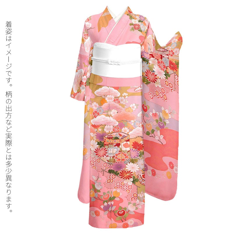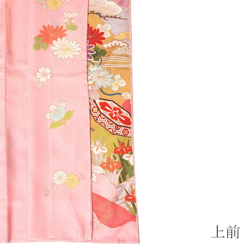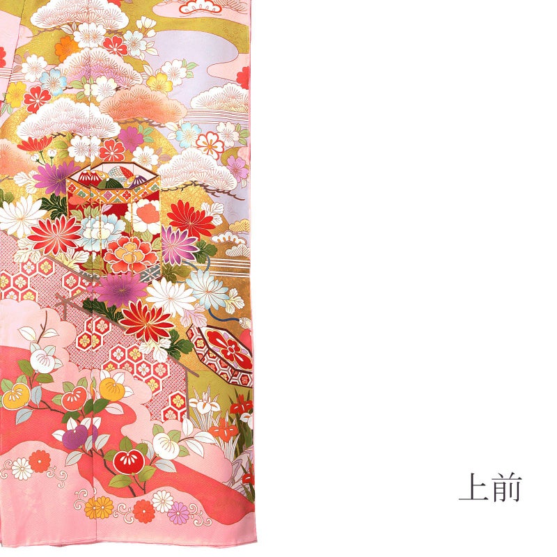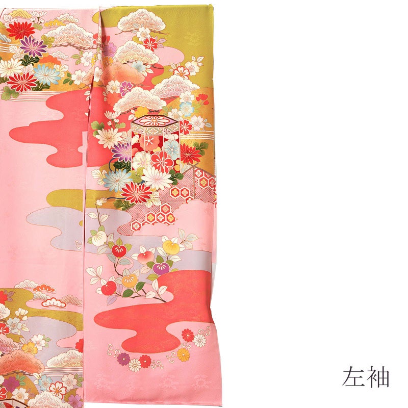 【色柄】紗綾形に花の地模様、やや灰みのやわらかいピンク色の地。淡い抹茶色や灰青、金茶色の霞に遠山、白に淡いピンクや珊瑚色ぼかしの松。赤や水色、橙などの菊に貝桶、梅や橘の花紋。ポイントの金彩や金駒刺?が豪華さを添えます。八掛はピンク地に菊や橘の花紋。