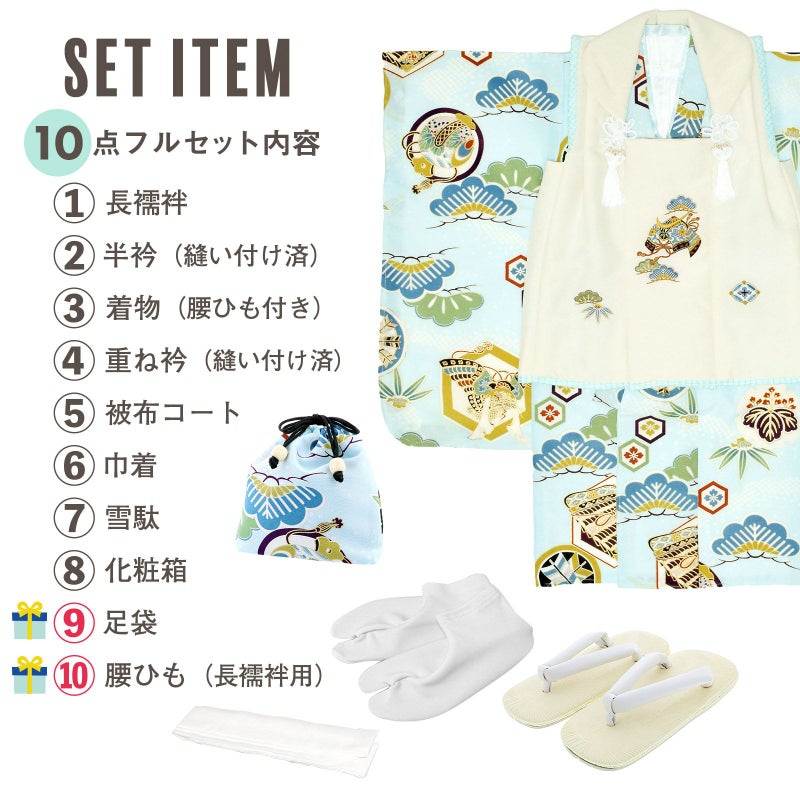 【商品内容】長襦袢・半衿(縫い付け済)・着物(腰ひも付き)・重ね衿(縫い付け済)・被布コート・巾着・雪駄・化粧箱・足袋(プレゼント)・腰ひも(長襦袢用/プレゼント)の10点セット