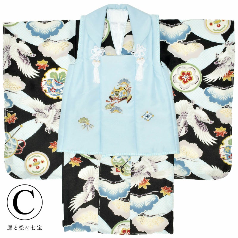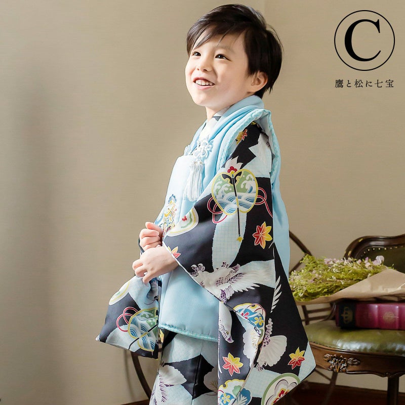 C鷹と松に七宝:被布コートは水色。兜に松や七宝の刺繍。肩と裾に水色の鹿の子模様のふち取り。被布飾りは白の組紐の房飾り。着物は黒地に水色の大きな七宝文様。淡いグレーベージュや灰青に金彩の松。灰白色に紫紺の羽の鷹。軍配や吉祥柄の丸紋の合間に赤橙色の紅葉の葉。淡いグレーベージュに浅緑や深い赤の配色、金彩。淡い水色の半衿、白の長襦袢には、紗綾形の地模様があります。巾着は着物と共生地です。