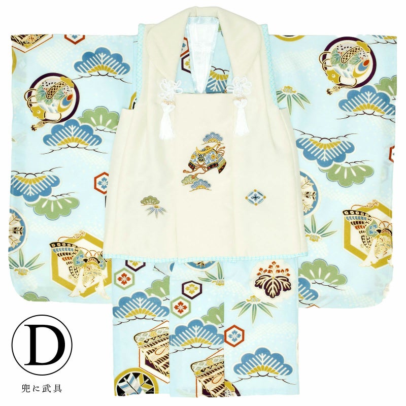 D兜に武具:被布コートはオフホワイト。落ち着いた水色を基調とした兜に松や七宝の刺繍。肩と裾に水色の鹿の子模様のふち取り。被布飾りは白の組紐の房飾り。着物は淡い水色地に鹿の子の文様。浅い緑や浅葱色の松や笹。亀甲に兜、鎧縅を中心に、丸に矢車、雪輪に桐、亀甲に花菱などの吉祥柄。白に金茶色、落ち着いた水色、浅緑、臙脂色や濃紫の配色に金彩。淡い水色の半衿、白の長襦袢には、紗綾形の地模様があります。巾着は着物と共生地です。