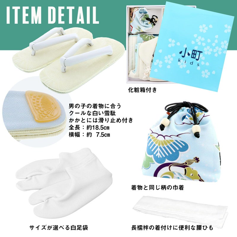 長襦袢・半衿(縫い付け済)・着物(腰ひも付き)・重ね衿(縫い付け済)・被布コート・巾着・雪駄・化粧箱のセットです。