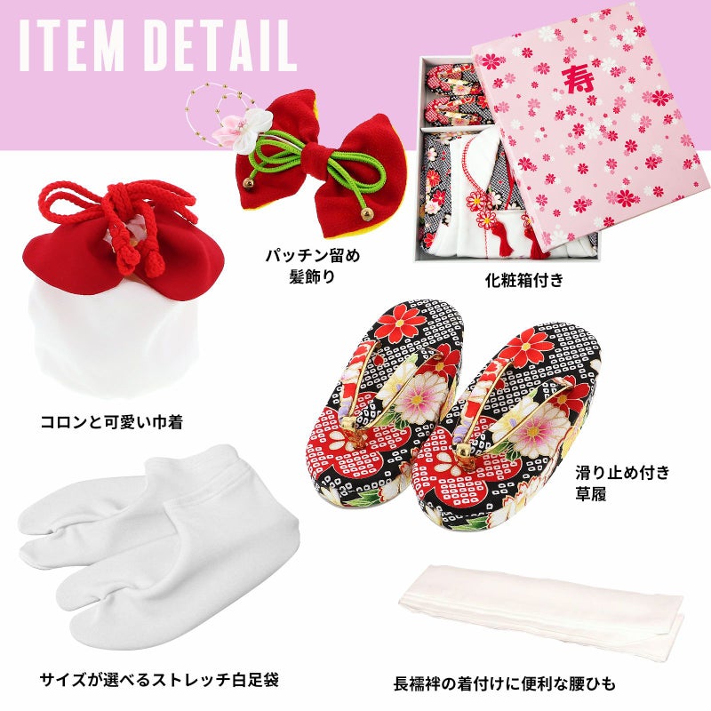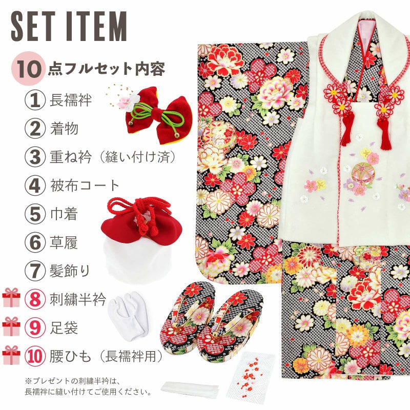 【商品内容】長襦袢・着物・重ね衿(縫い付け済)・被布コート・巾着・草履・髪飾り・刺繍半衿(プレゼント)・足袋(プレゼント)・腰ひも1本(プレゼント)の10点セット