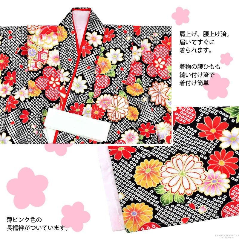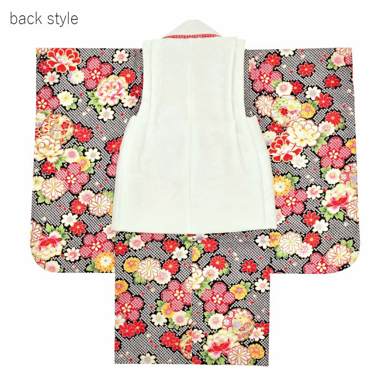 ※着物はすでに身上げ、肩上げが施されています。3歳のお祝いをするお子様の平均身長に合わせて、身長90~100cmぐらいのお子様がぴったりと着ていただけるサイズになっています。もしそれでは大きい、もしくは小さいようでしたら身上げ、肩上げを一度解いていただいて、お子様に合わせて、再度縫い上げてください。