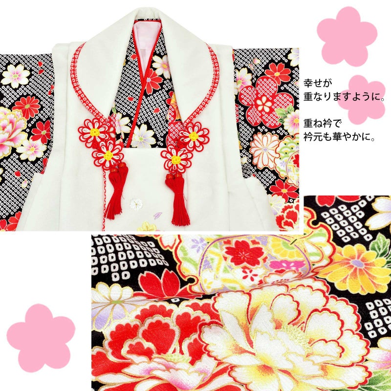 被布コートは白地に薄ピンクに薄緑の桜や手毬の刺繍。衿周りに赤の疋田模様のふち取り。紅白の菊結びの被布飾りがついています。着物は紗綾形の地模様、黒白の染めの疋田模様。白や赤、黄色に緑、ピンクのぼかしの牡丹に菊、梅などの草花に雪輪や鈴紋。ポイントに金彩。重ね衿は赤色。ごく薄いピンクの長襦袢。草履は着物と共生地。巾着は白地に赤の見返し。赤黄のリボンに黄緑の組紐、薄ピンクのつまみのお花、ビーズ飾りを組み合わせた髪飾り。