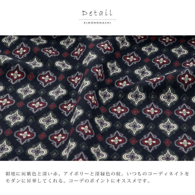 【カラー】紺地に灰紫色と深い赤、アイボリーと深緑色の紋。