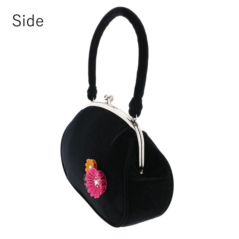 【カラー】バッグの持ち手と本体は黒のベロア地。深いピンク、深緑、からし色にパールビーズのつまみのお花。口金はシルバー。草履の鼻緒は黒地に深い赤紫、シルバーの刺繍、ポイントにパールビーズが施された菊の花。鼻緒の裏地は白。前坪はゴールド。台は黒の天に、芯の巻きは黒のベロア地。ゴールド、白の飾り芯。
