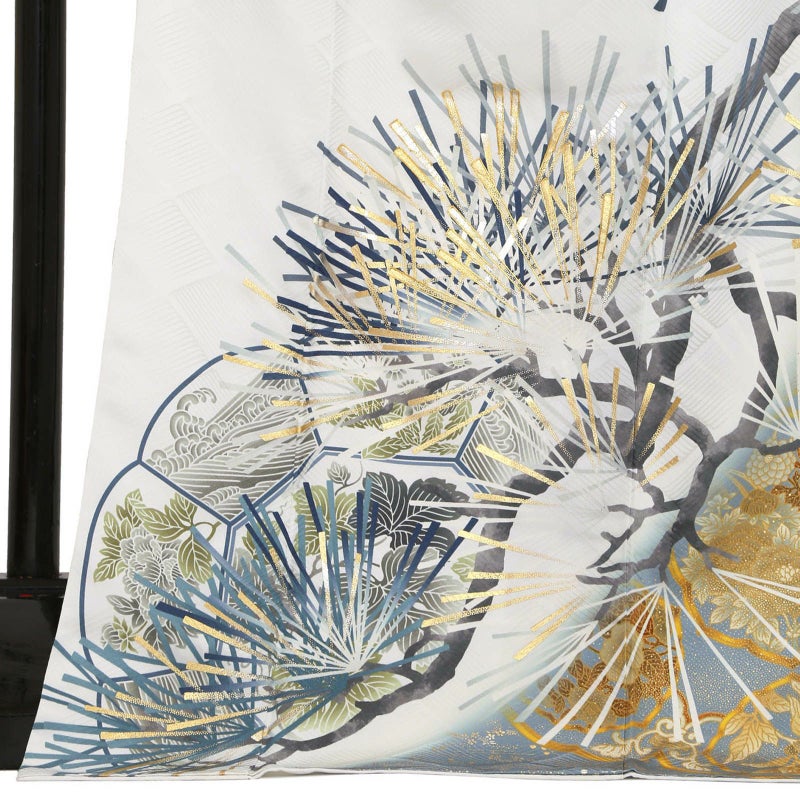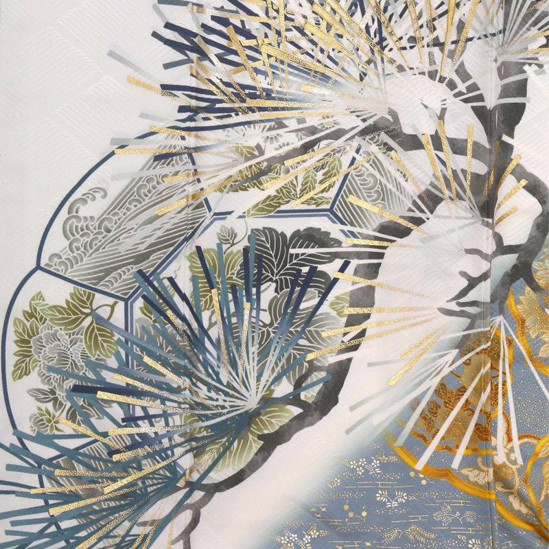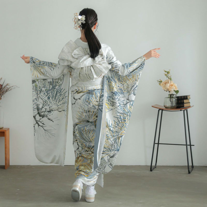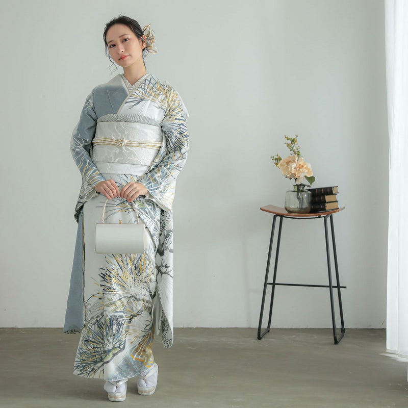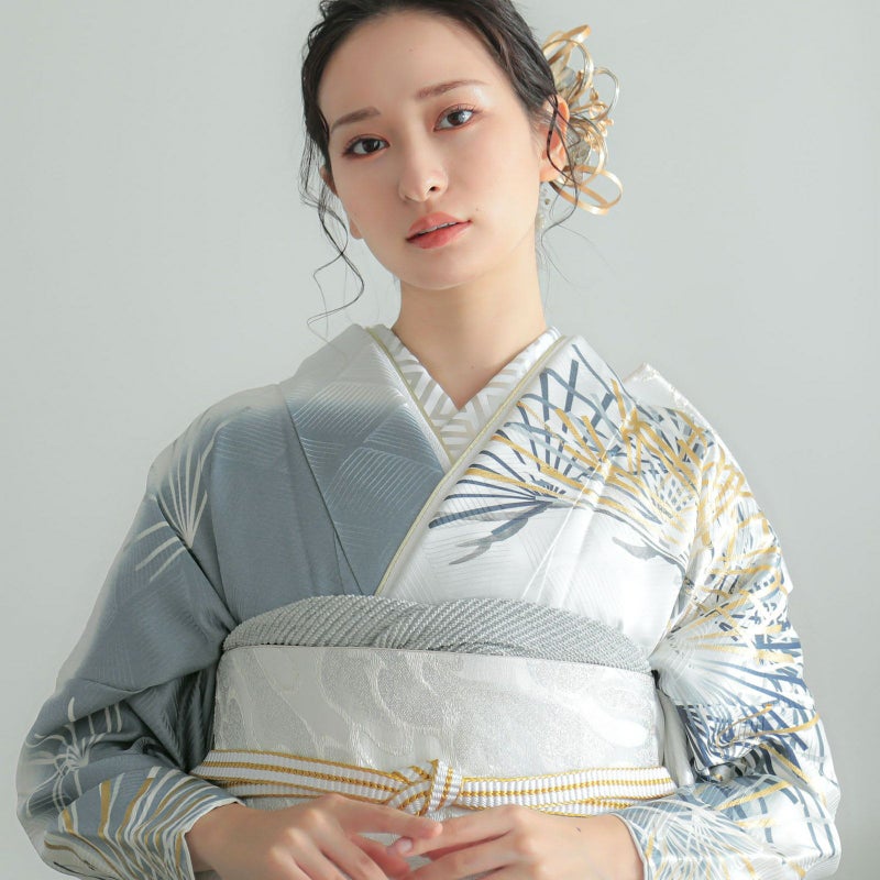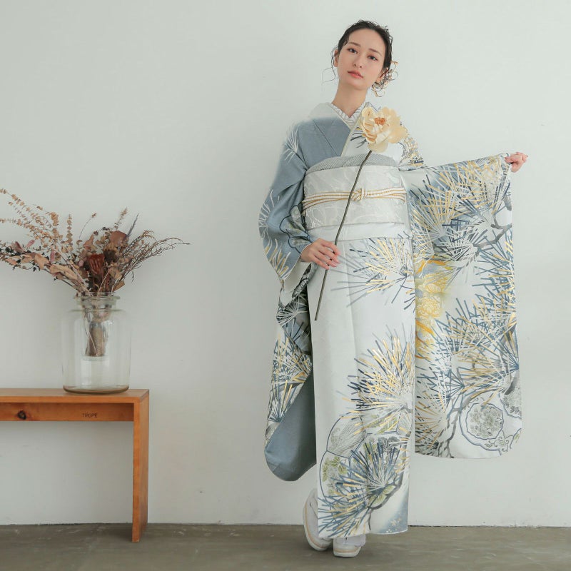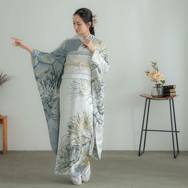 シルバーグレーに松を描いた、シンプルでスタイリッシュな振袖です。 松は古くから長寿の象徴として親しまれており、お祝い事にピッタリの柄です。 松の柄には、立体感のある金駒刺繍が施されているので迫力があり、成人式は自分らしく、かっこいい振袖が着たい!という方におすすめの振袖です。
