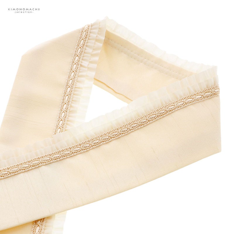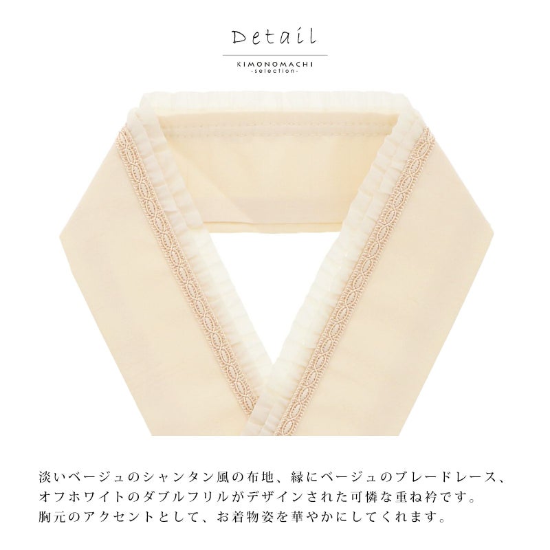 お着物の衿元をより華やかにしてくれる、繊細で美しいダブルフリルがアクセントになる重ね衿(伊達衿)です。とても上品な印象で、派手になりすぎず、さりげないお洒落にぴったり。衿止めピン付きなので、お着物に簡単に取り付け可能です。