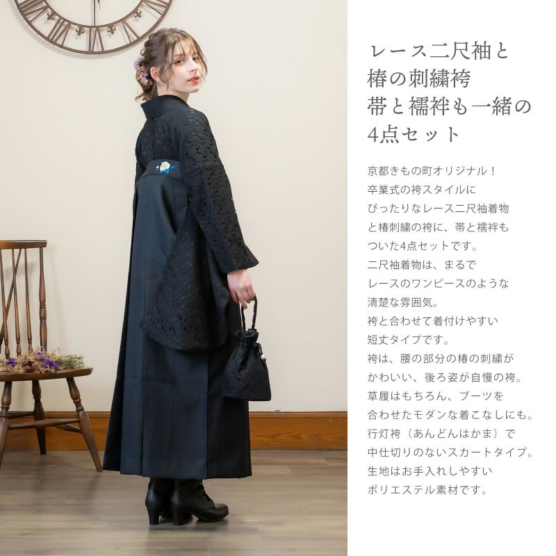 卒業式の袴スタイルにぴったりなレース二尺袖着物と椿刺繍の袴に、帯と襦袢もついた4点セットです。