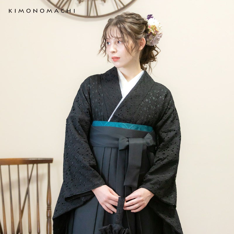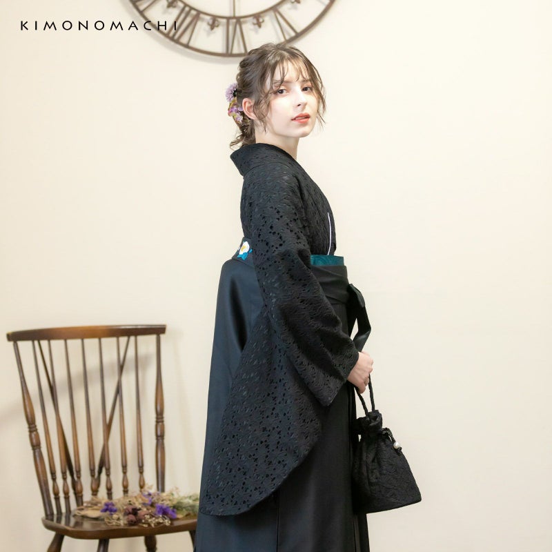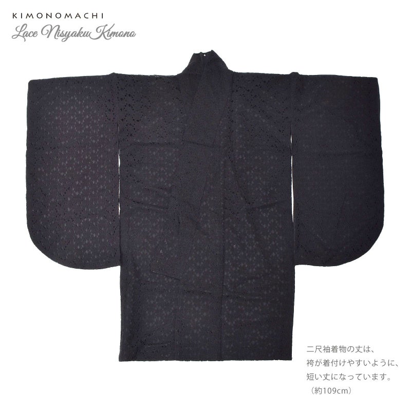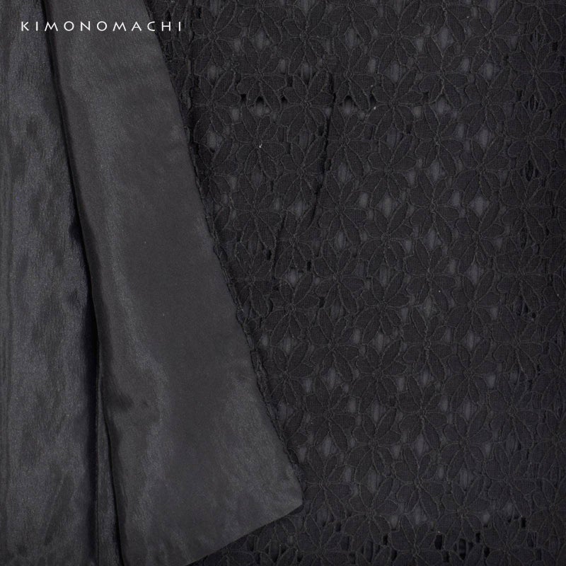 二尺袖着物:黒のエレガントなフラワーレースに黒の色裏地を重ねた配色。黒一色の中に浮かび上がるレースの陰影が艶やかな雰囲気です。