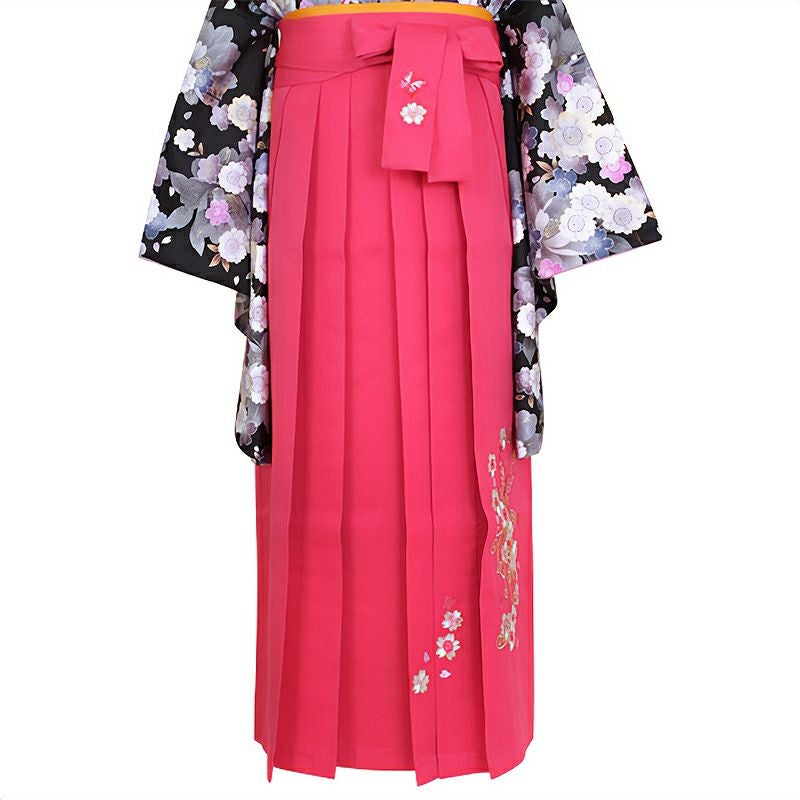 卒業式の装いにぴったりの袴単品です。中仕切りのない行灯袴(あんどんはかま)ですので、丈の長い着物でも合わせていただけます。洋服のスカートと同じようにお召しいただけます。振袖や二尺袖着物に合わせやすい華やかな袴です。生地はお手入れしやすいポリエステル素材です。草履はもちろん、ブーツを合わせたモダンな着こなしもいいですね。