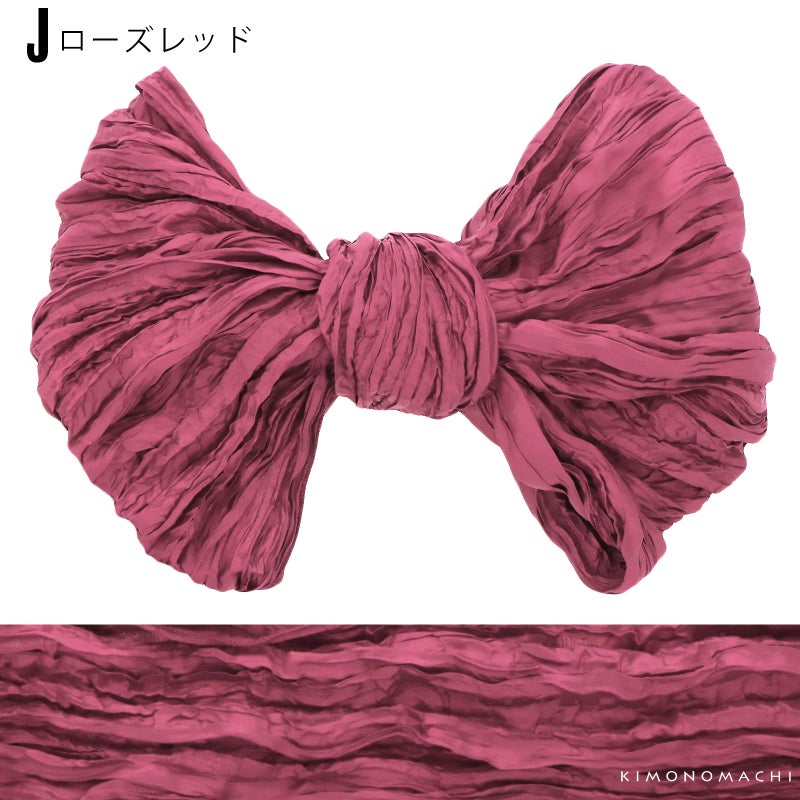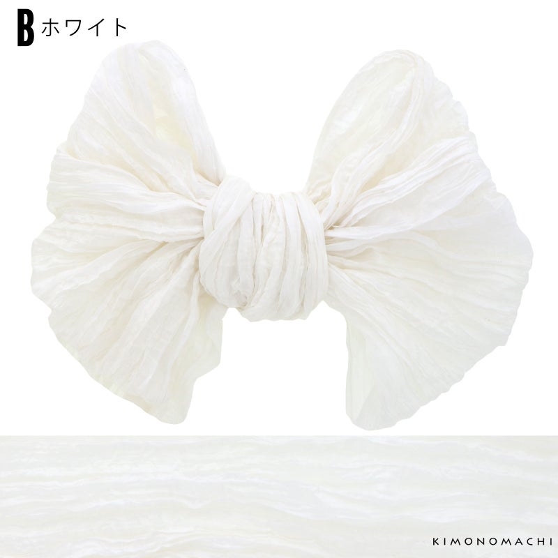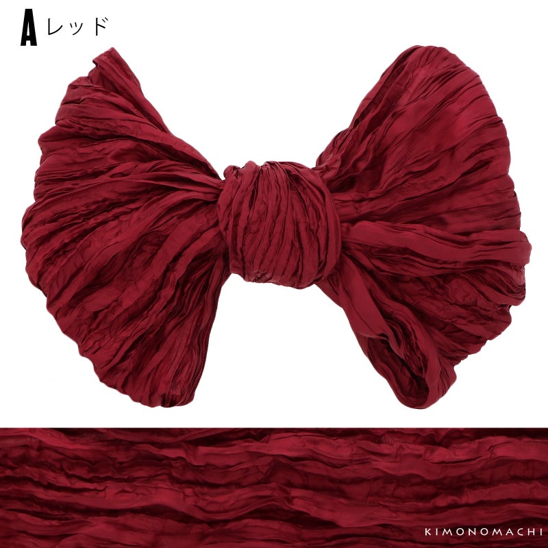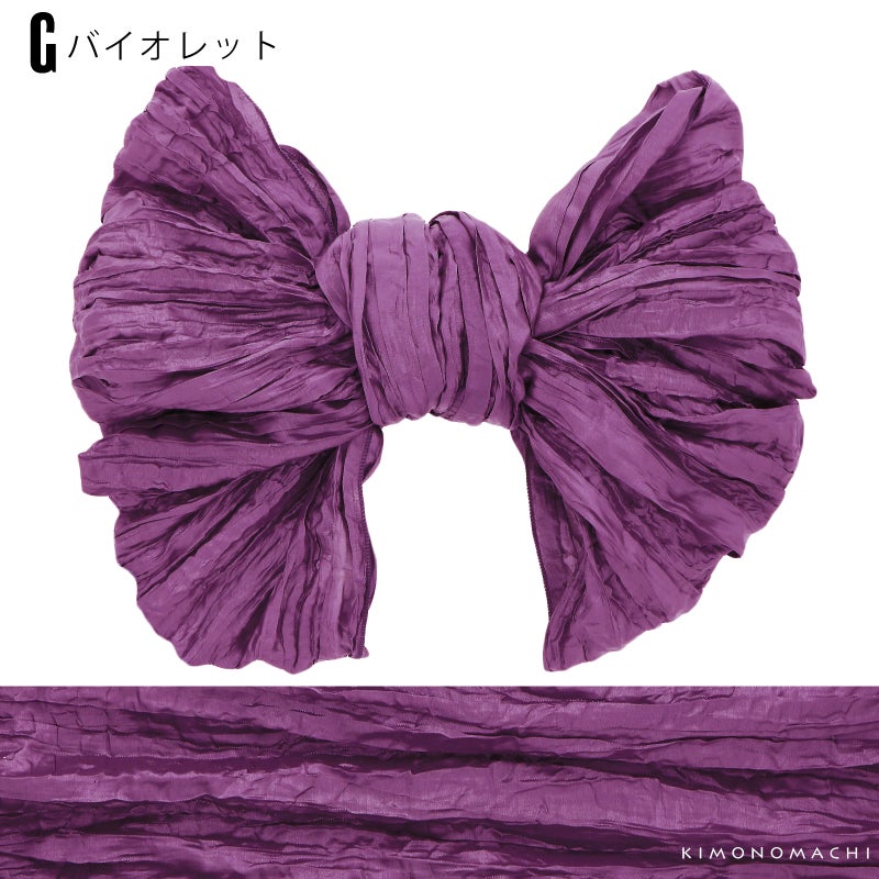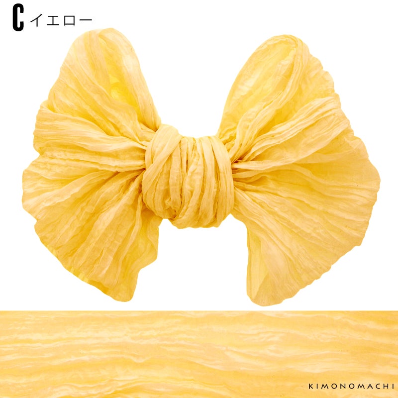 しわ加工の施された、シャリ感のあるやわらかい生地です。柔らかくて幅が広いので、ボリューム感のあるリボン結びが簡単にできます。帯に重ねて結んで、飾り帯にしてもかわいい!