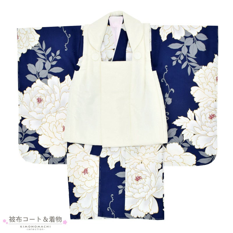 被布コートはオフホワイトに唐草の地模様。くるみボタンの被布飾り。着物は紗綾型の地模様のある紺青の地、金茶色の輪郭線にアイボリーや淡いブルーグレーの花びらの大輪の牡丹の花模様。重ね衿は薄ピンク。薄ピンクの長襦袢。草履はラメ感のあるプラチナシルバー。着物と共布の巾着。