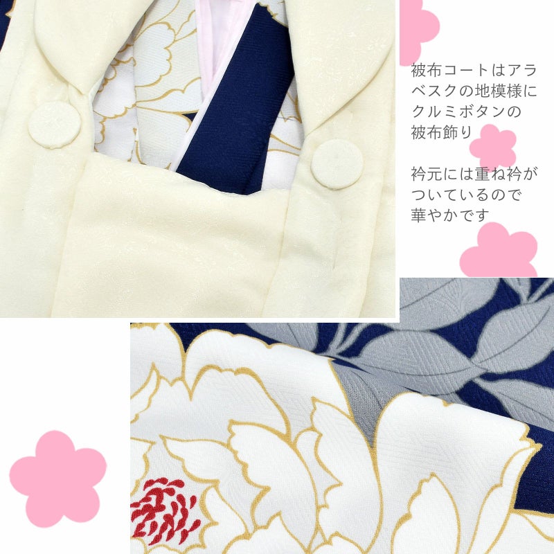 女の子の七五三に!3歳から着られる被布セットです。お着物には重ね衿が縫い付けられています。女の子らしく可愛くて華やかなデザイン。七五三だけでなく、お正月やひな祭りの節句にも。