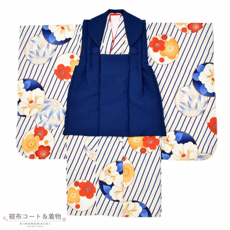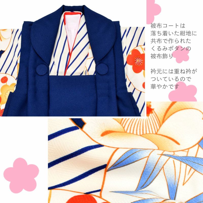 被布コートは紺色。くるみボタンの被布飾り。着物はオフホワイトの地に、紺の斜めストライプ、橙色の丸に朱色や橙色の梅、椿、笹など。重ね衿は赤。薄ピンクの長襦袢。草履は白の台に赤地の刺繍の鼻緒。着物と共布の巾着。