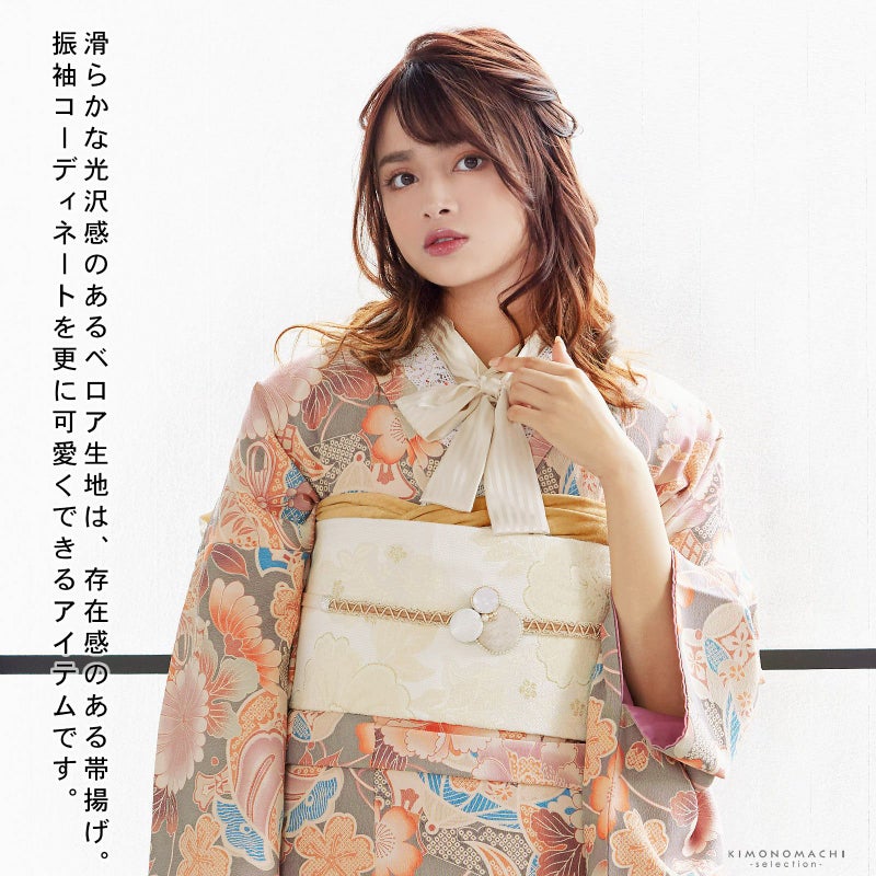 滑らかな光沢感のあるベロア生地は、存在感のある帯揚げで着物を華やかに彩り、成人式の振袖などによくお似合いです。