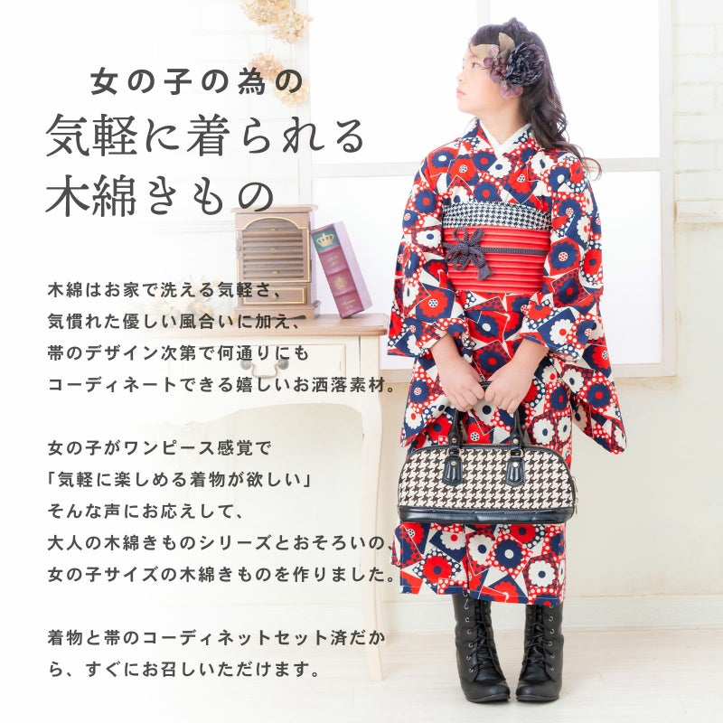 女の子がワンピース感覚で、「気軽に楽しめる着物が欲しい」そんな声にお応えして、大人の木綿着物シリーズとおそろいの、女の子サイズの木綿きものを作りました。