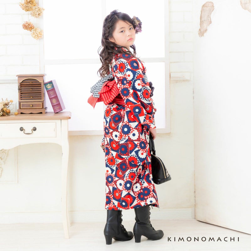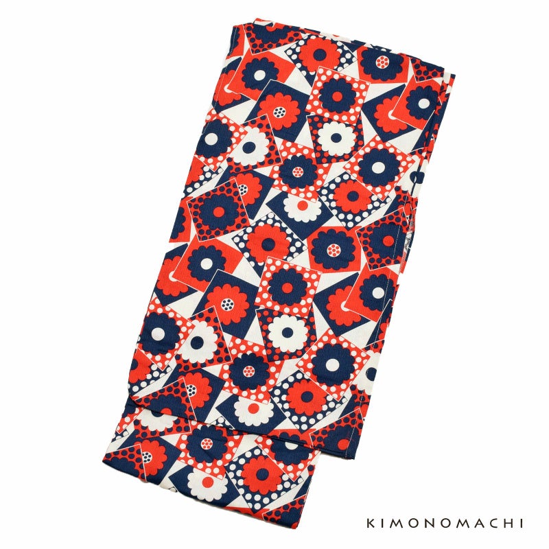 着物:わずかに生成りみを含んだ白色地に、赤、ネイビーの色使いのスクエアにドット、レトロなお花模様