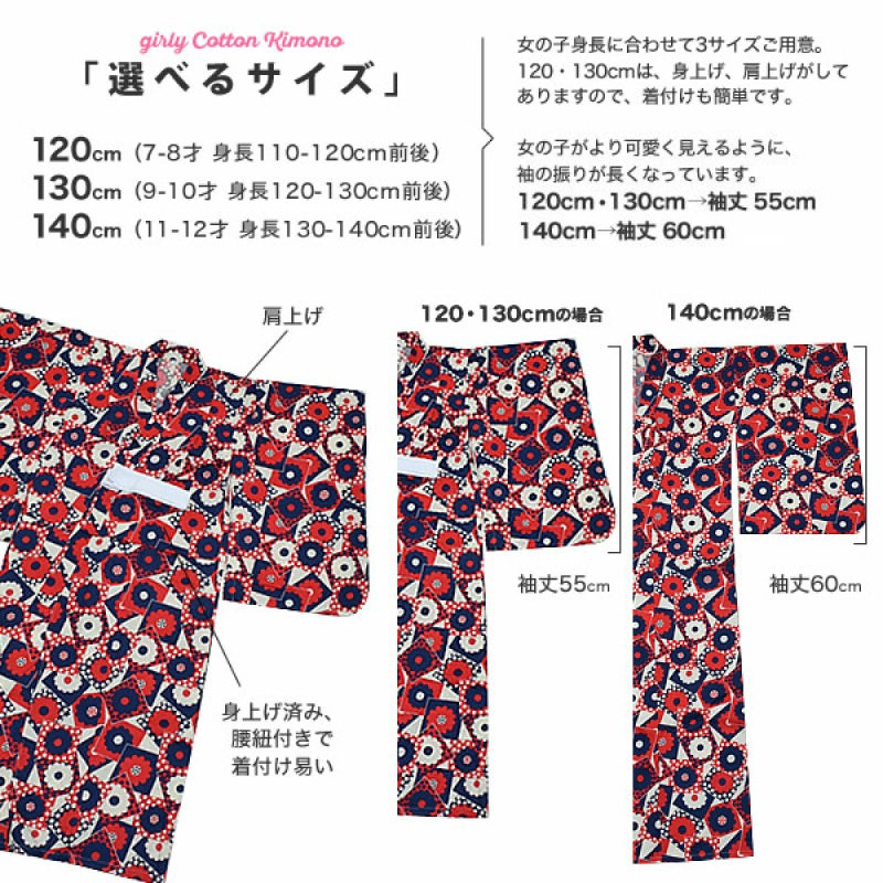 120cm、130cmサイズは、身あげ、肩あげをしていて、腰紐が縫い付けてあります。140cmは身あげ、肩あげがなく、大人と同じ仕立てです。すべて、お袖が長いので、こどもらしい可愛らしい雰囲気です。