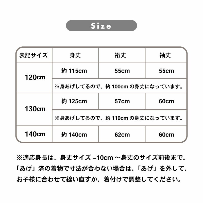 ※適応身長は、身丈サイズ-10cm~身丈のサイズ前後まで。あげのしてある着物で寸法が合わない場合は、あげを外して、お子様に合わせて縫い直すか、着付けで調整してください。