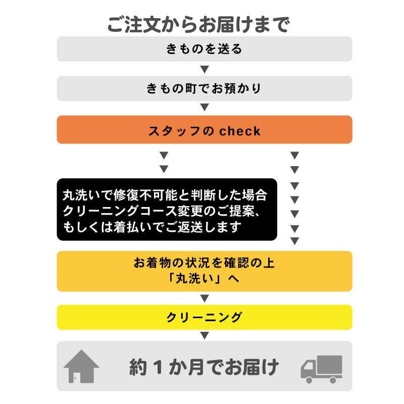 丸洗いだけでは落ちない汚れがあった場合でも、「着物丸洗いクリーニング-京洗い仕上げ-」をお選びいただいた場合、丸洗いのみで進行いたします。