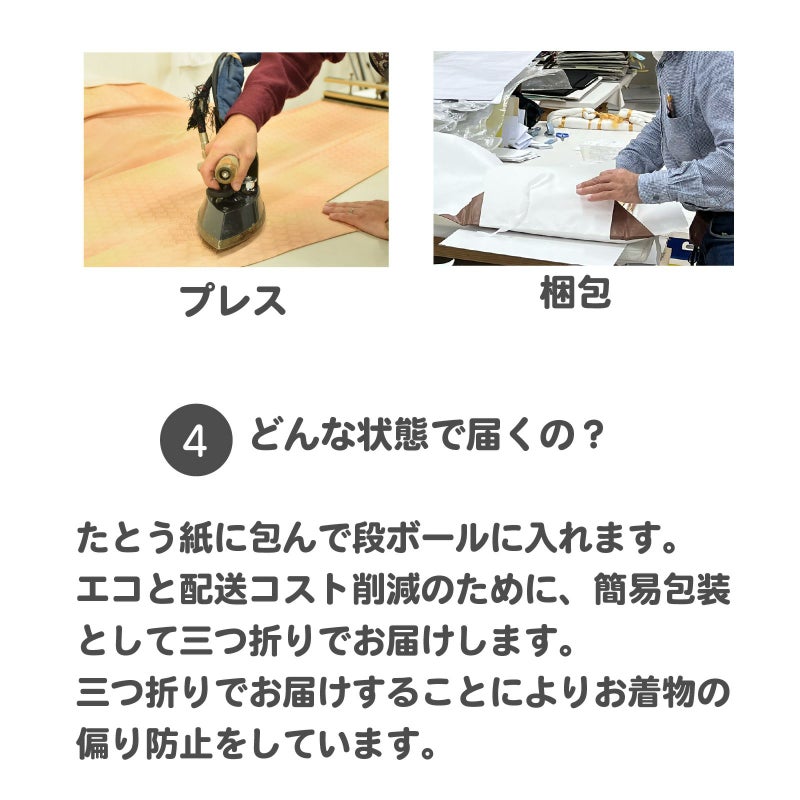 三つ折りでお届けすることによりお着物の偏り防止をしています。