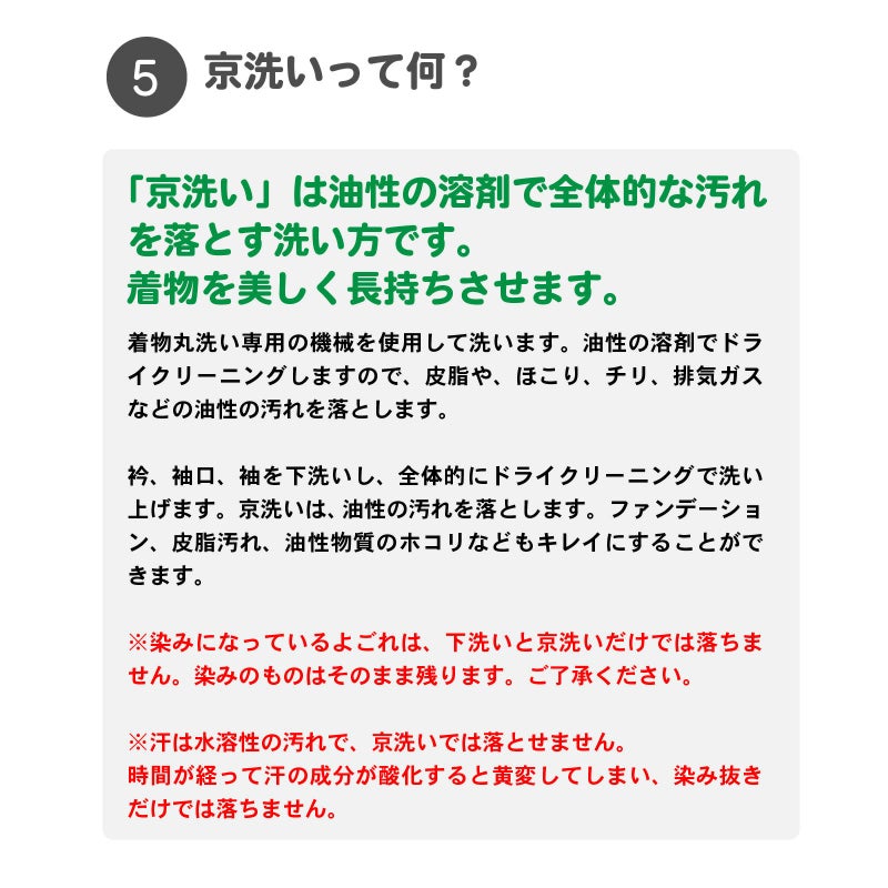 衿、袖口、袖を下洗いし、全体的にドライクリーニングで洗い上げます。京洗いは、油性の汚れを落とします。ファンデーション、皮脂汚れ、油性物質のホコリなどもキレイにすることができます。