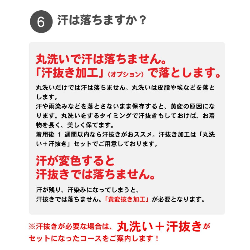 ※「汗抜き」が必要な場合は、丸洗い+汗抜きがセットになったコースをご案内します!