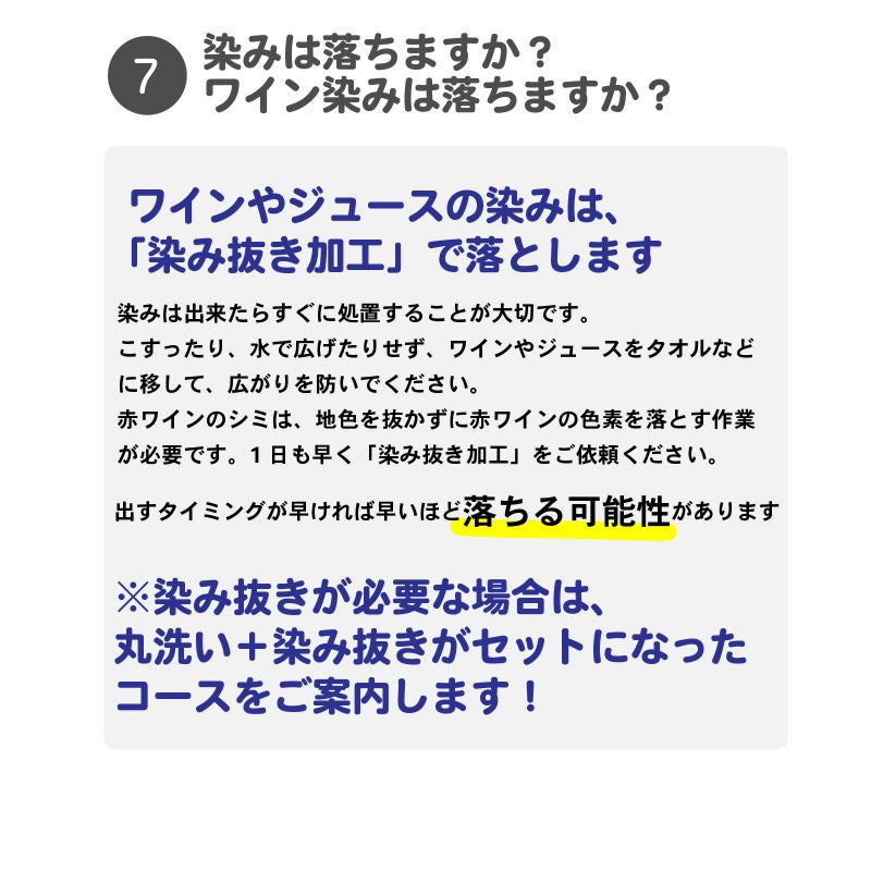 ※染み抜きが必要な場合は、丸洗い+染み抜きがセットになったコースをご案内します!