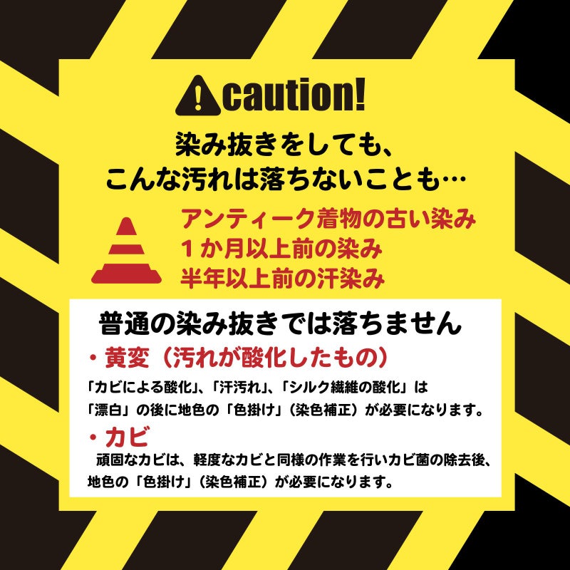 「カビによる酸化」、「汗汚れ」、「シルク繊維の酸化」は「漂白」の後に地色の「色掛け」(染色補正)が必要になります。