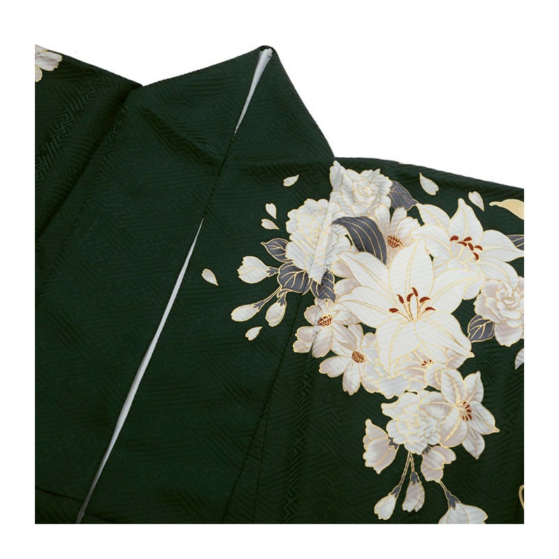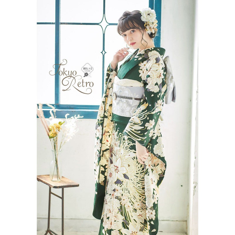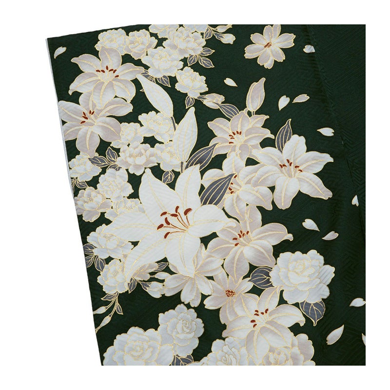 深緑に百合と乱菊を描いた「東京レトロ」の振袖。地色はシックですが、柄行は、袖や裾いっぱいに描かれ、華やかな印象です。