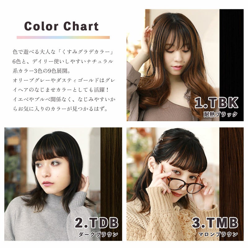 生え際や表面は自分の髪だからこそ、とてもナチュラルに仕上がります。カラーはくすみ系グラデカラーとナチュラル系カラーの9色展開。お好みに合わせてカット出来るから、老若男女問わず簡単に使えます。