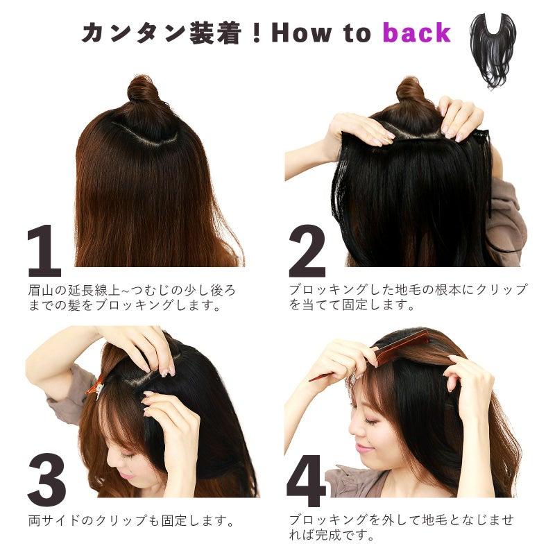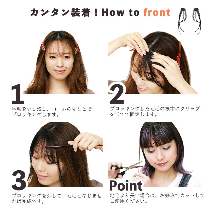 「分けて使える」左右のセパレート前髪と後ろ髪エクステの3点セットなので、ワンレンさんでもぱっつんさんでも、どんな髪型でも装着可能。