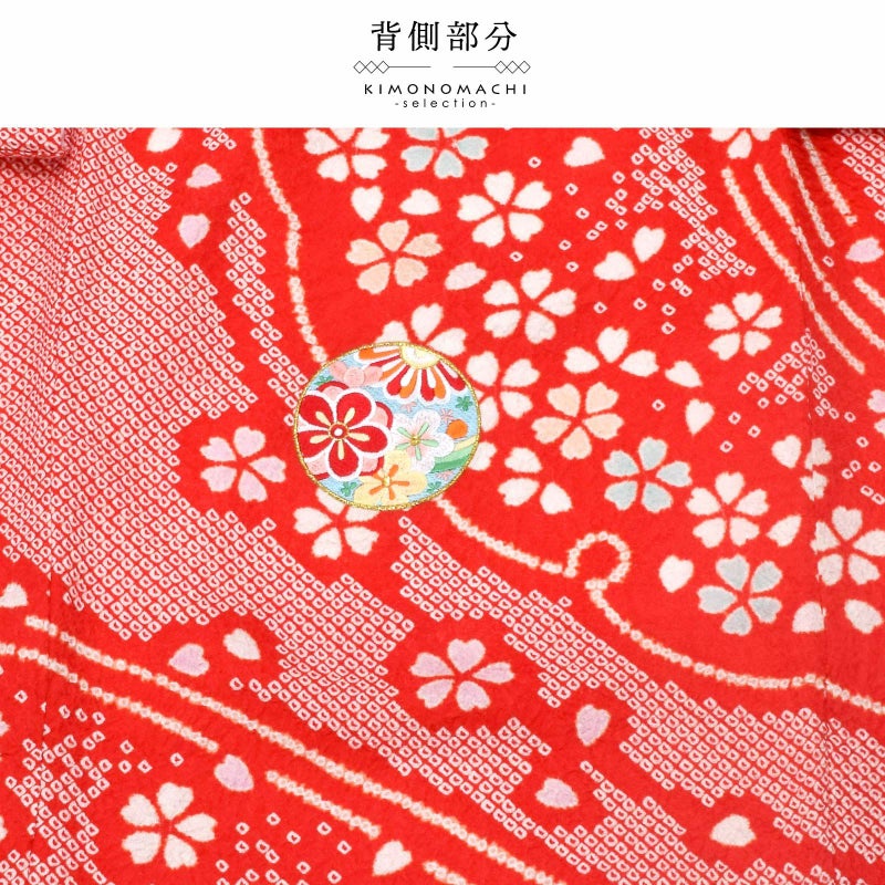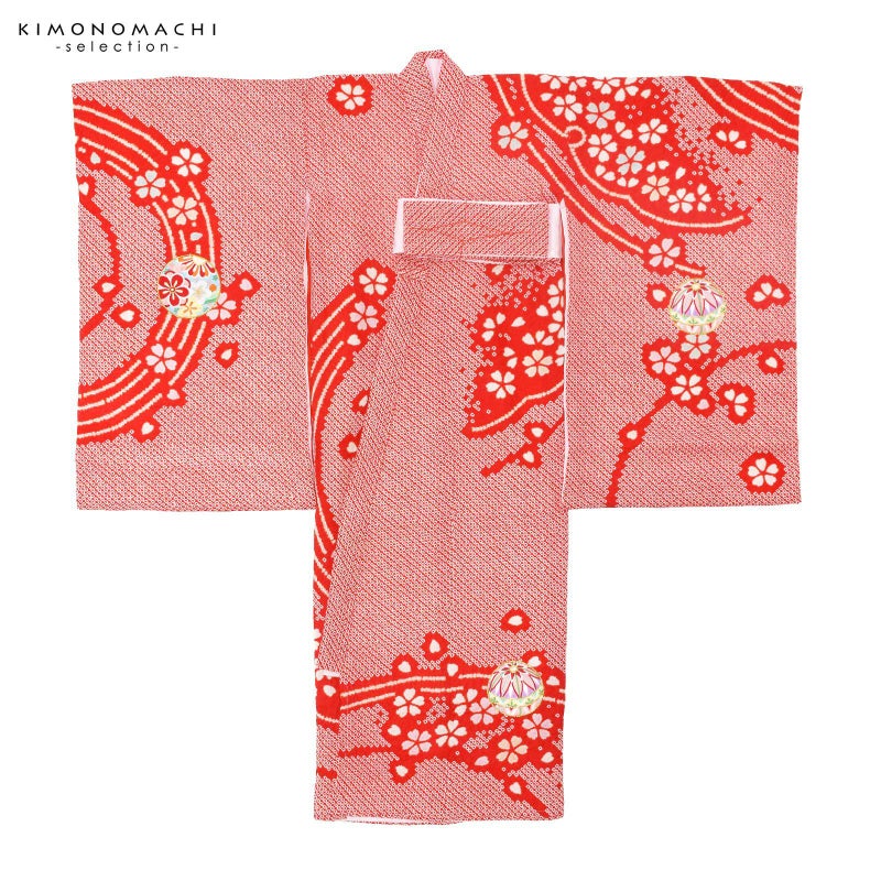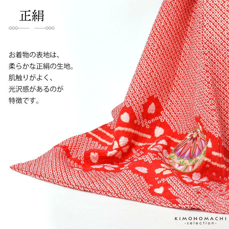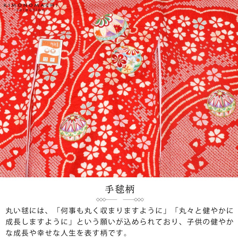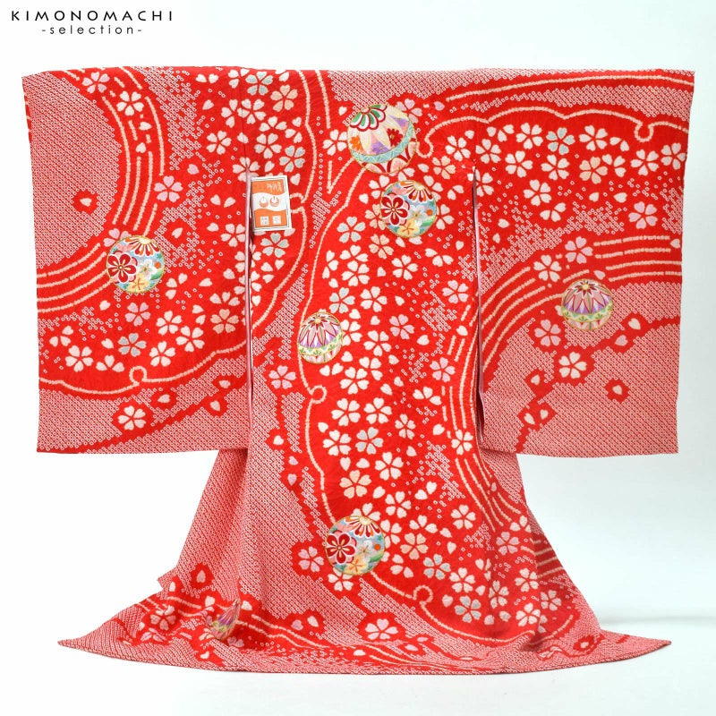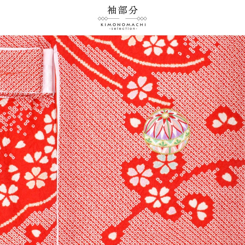 赤の疋田の地。背には、雪輪の弧を大きく切り取った雪芝文様に、淡いピンクや水色の挿し色の桜花。その上に、赤や白、水色、藤井色、薄黄色などの刺繍の手鞠が散らされています。絞りのやわらかな趣とつややかな刺繍が上品でかわいらしい印象。襦袢は薄ピンクの鶴に亀甲の地紋。振りは赤の鶴に亀甲の地紋。