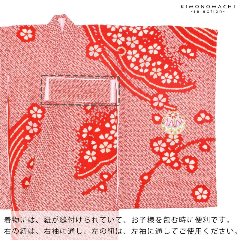 着物には紐が縫い付けられていて、お子様を包む時に便利です。右の紐は右袖に通し、左の紐は左袖に通してご使用ください。