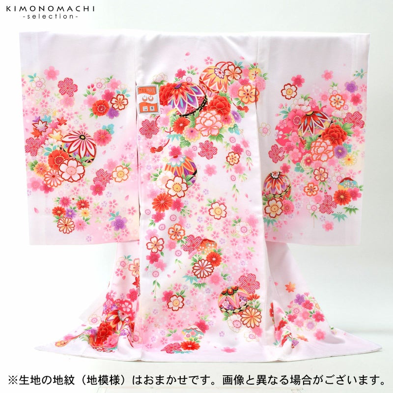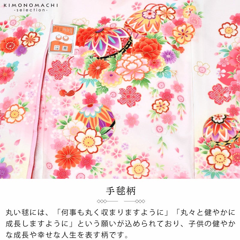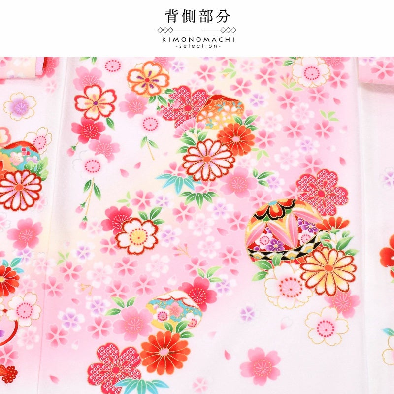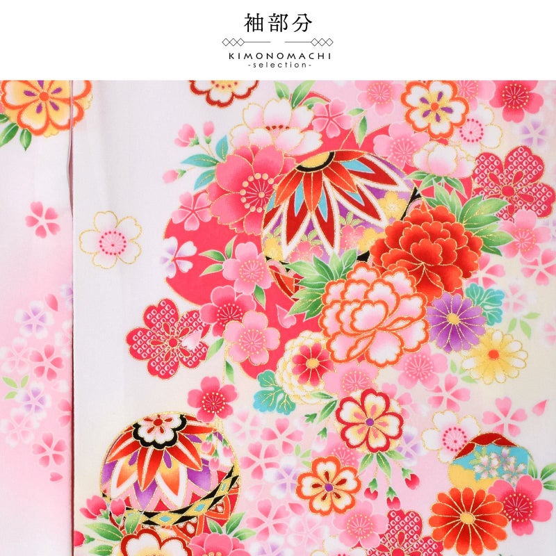 表地は白、襦袢の薄いピンクが映ってほんのり桜色に見える地。淡いクリーム色のぼかしの流線。赤や紫、ピンク、薄黄色、橙色に黒などの手鞠に赤い組み紐。牡丹に菊、桜の花々。花紋をあしらった貝合わせ文。ポイントの金彩が輝きを添えます。襦袢は薄ピンク。振りは赤。
